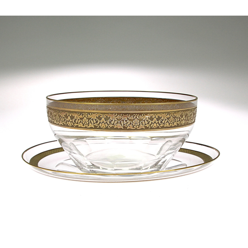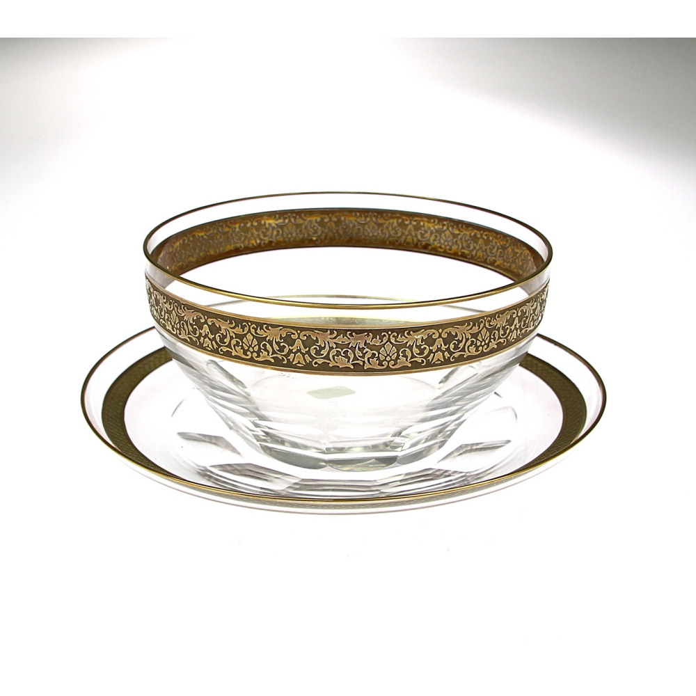 Miska s talířkem na kompot vyrobená z čirého skla, zdobená oroplastikou.