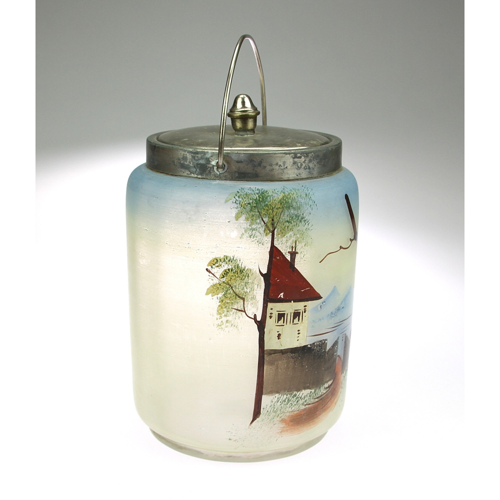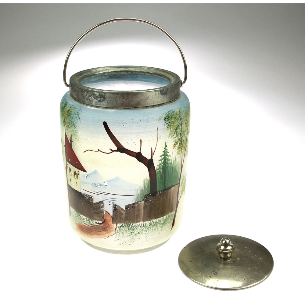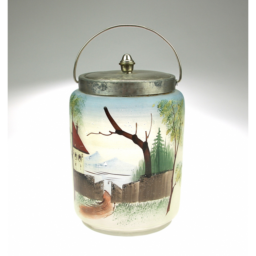 Nádoba na led vyrobená z malovaného skla a kovové montáže.