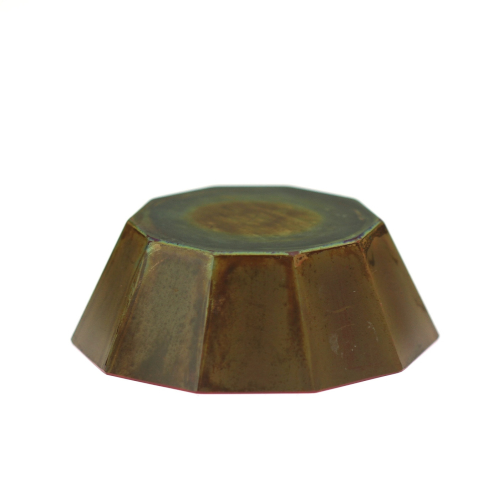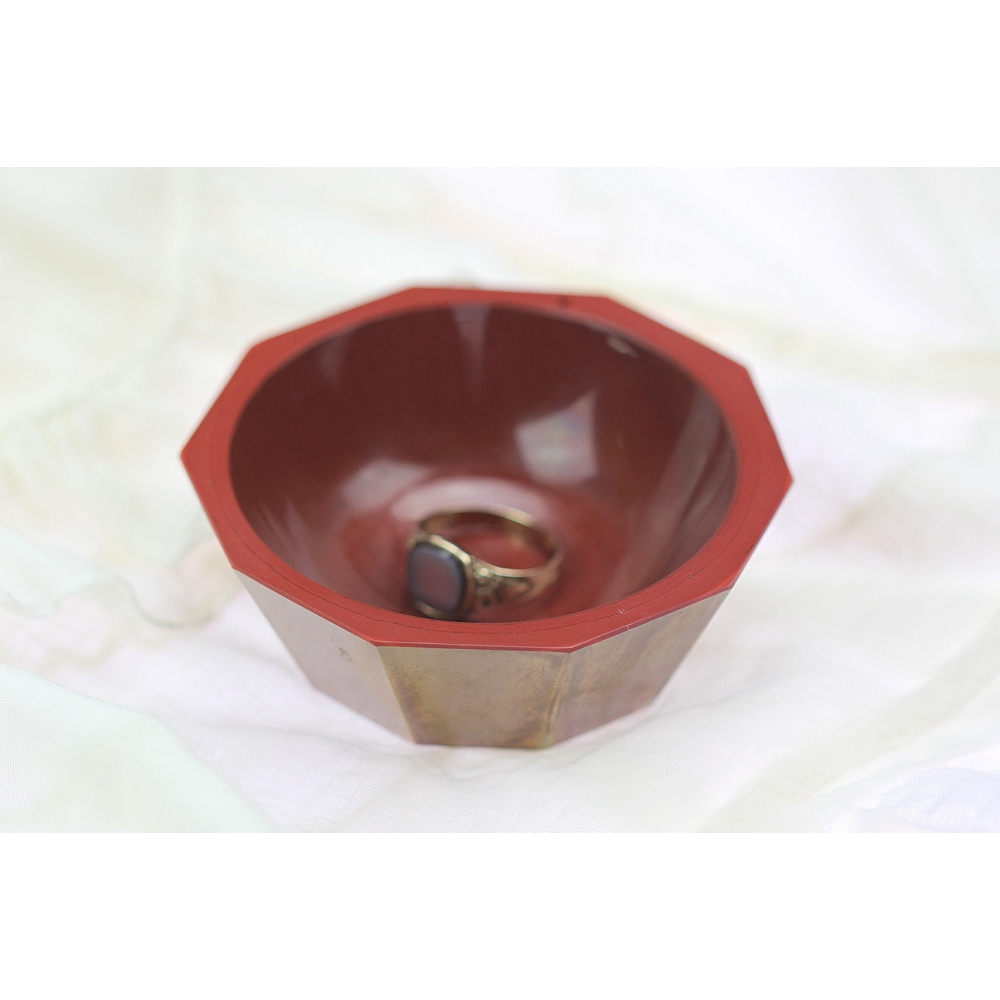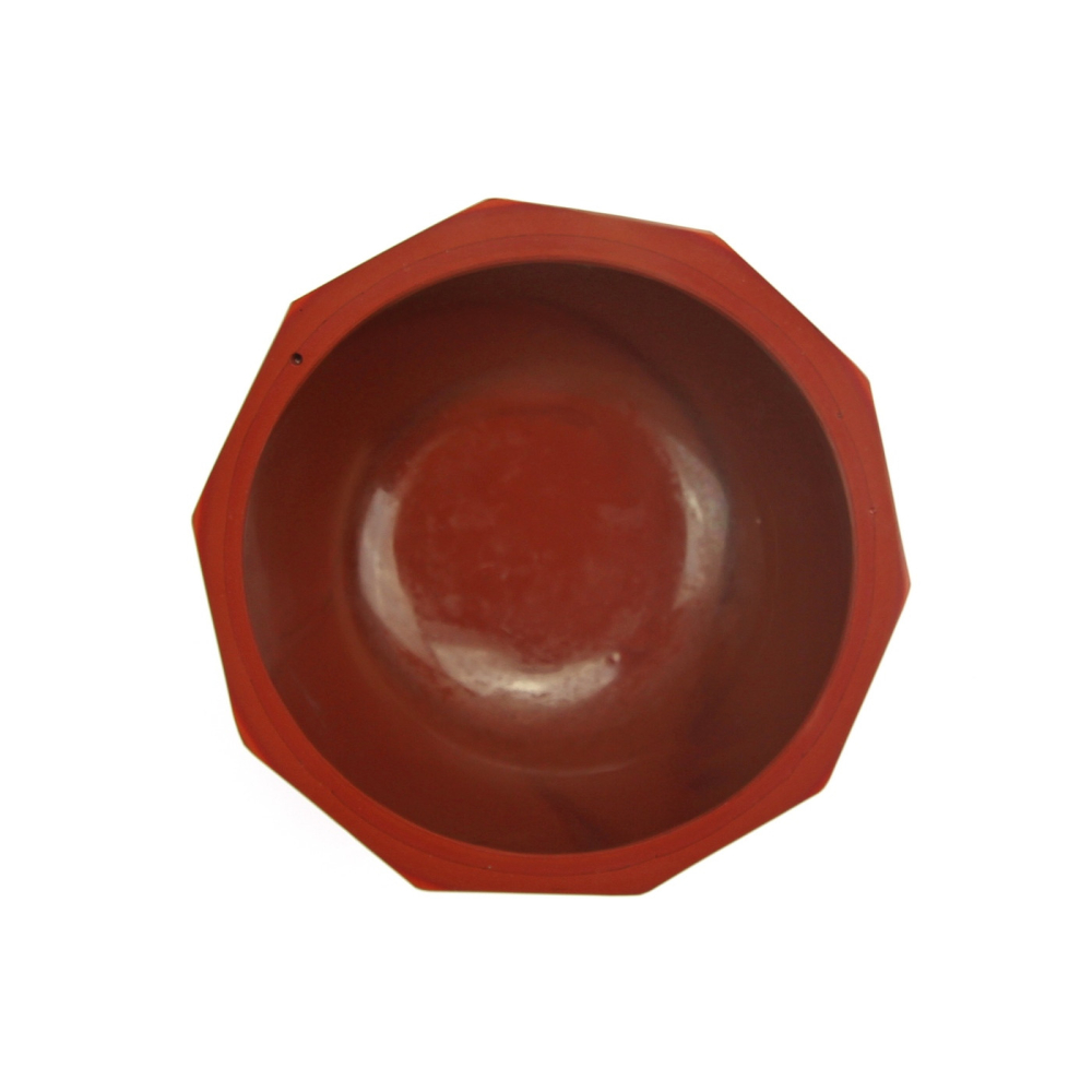 Menší silnostěnná miska vyrobená ze zcela opakního hyalitového skla cihlově červené barvy, také nazývané jako barva pečetního vosku.