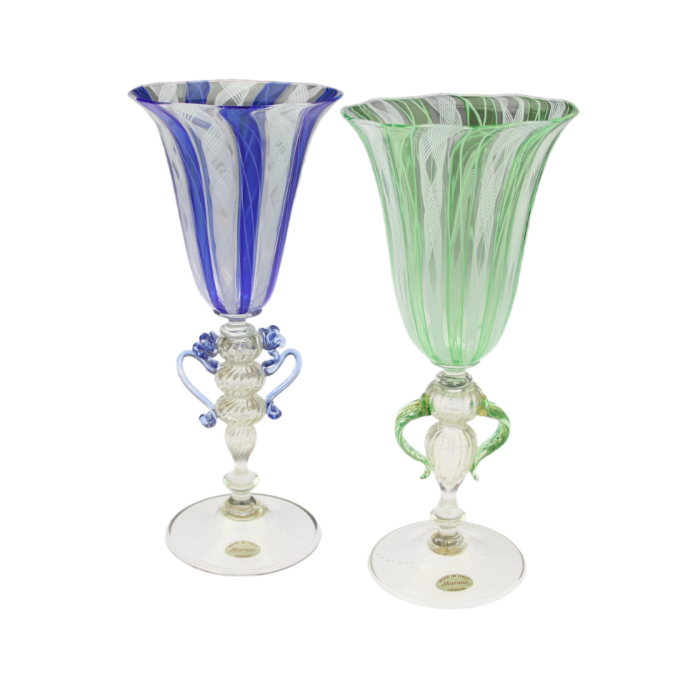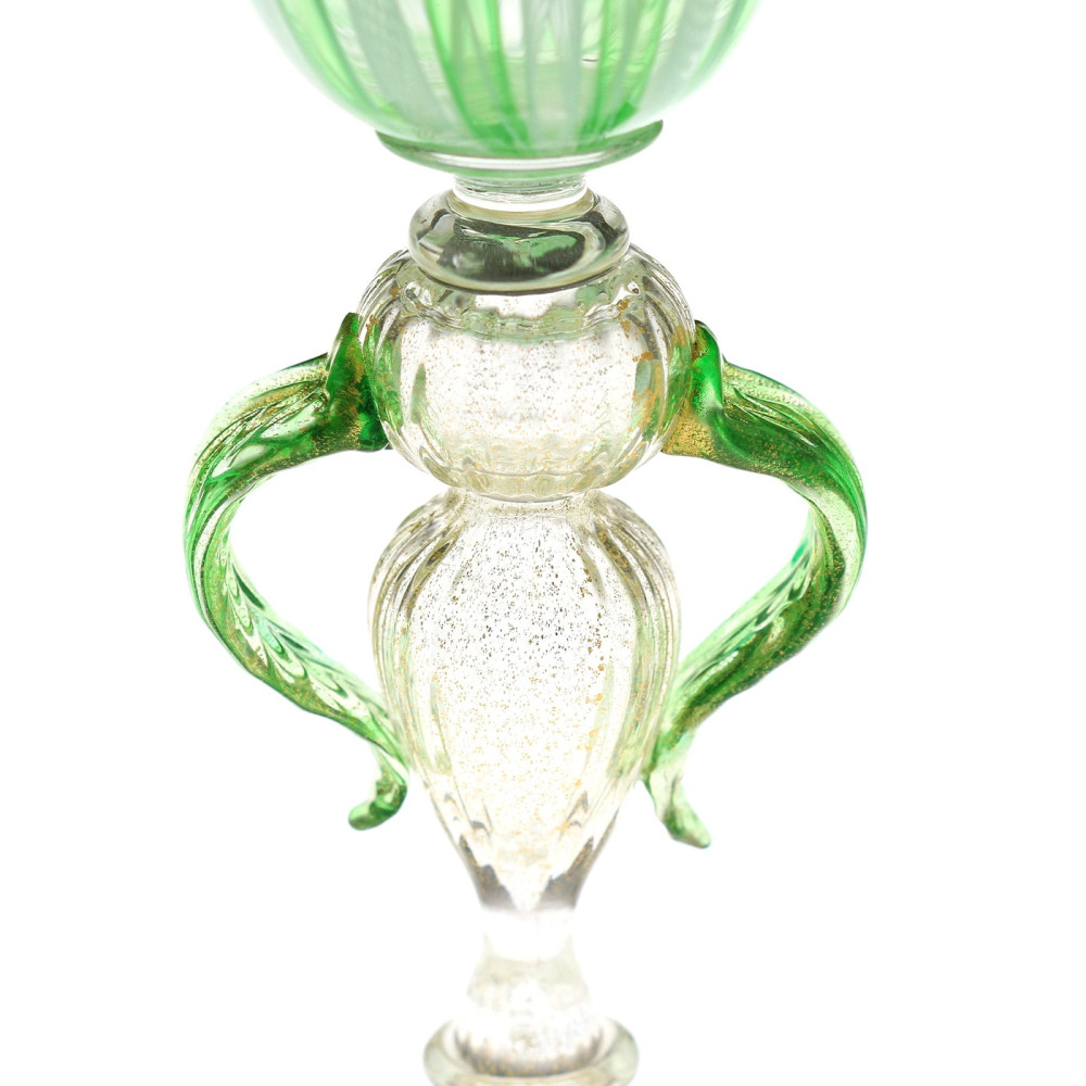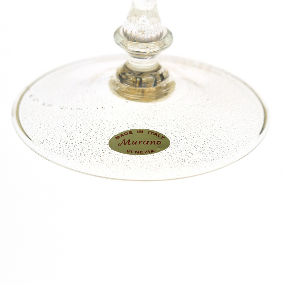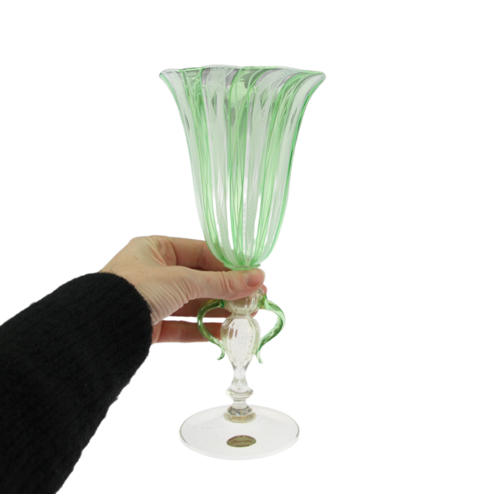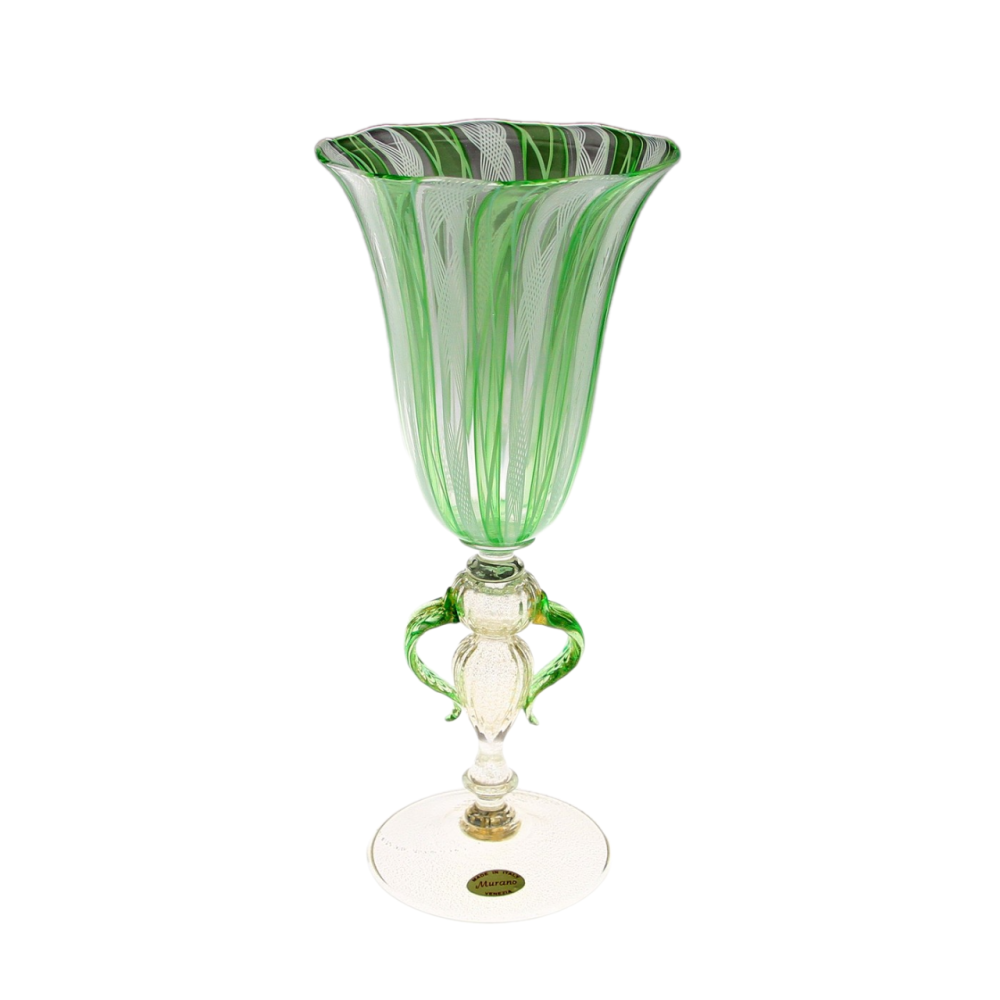 Pohár na speciálně tvarované nožce, tzv. "tipetto" je luxusním výrobkem muranských sklářských mistrů. Materiálem je tenkostěnné čiré a zelené sklo zdobené technikou dvojitě proplétaného filigránu (filigrana a retortoli či zafirico) a rozpuštěného plátkového zlata. Značeno originální samolepkou "Made in Italy - Murano - Venezia".