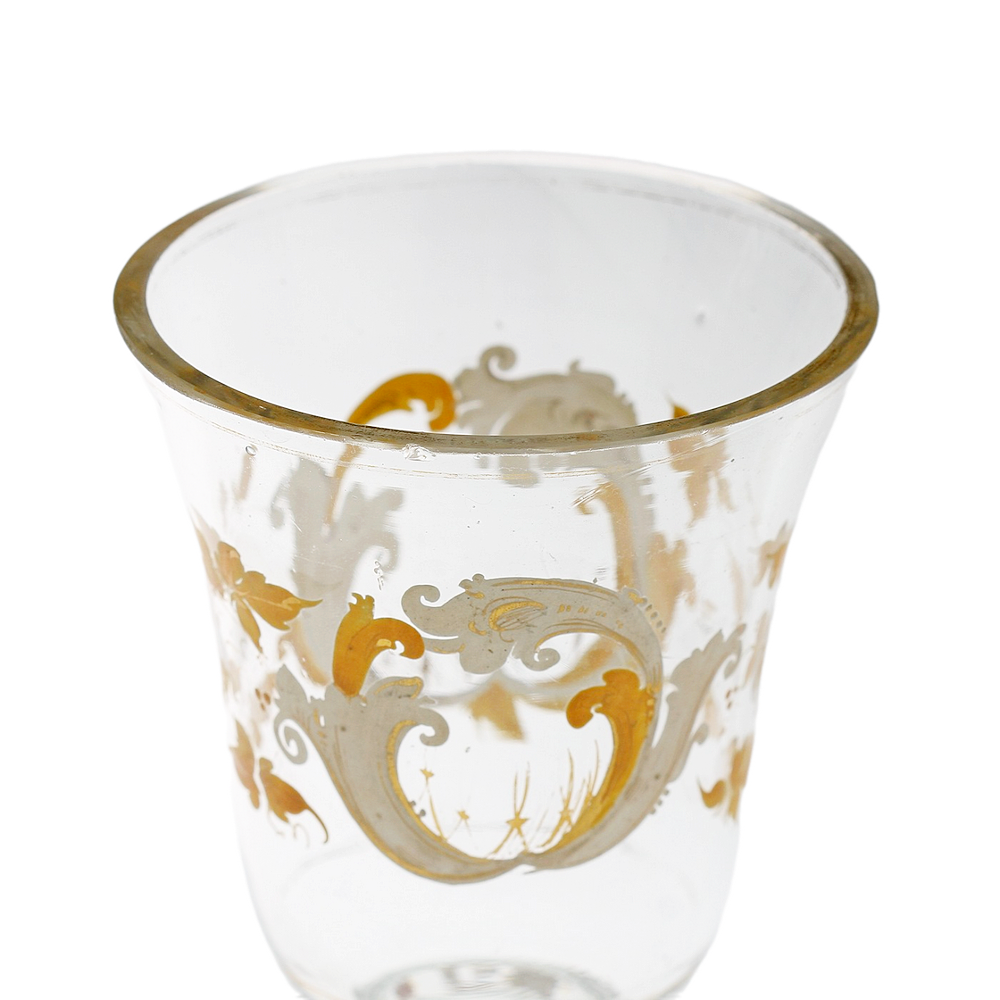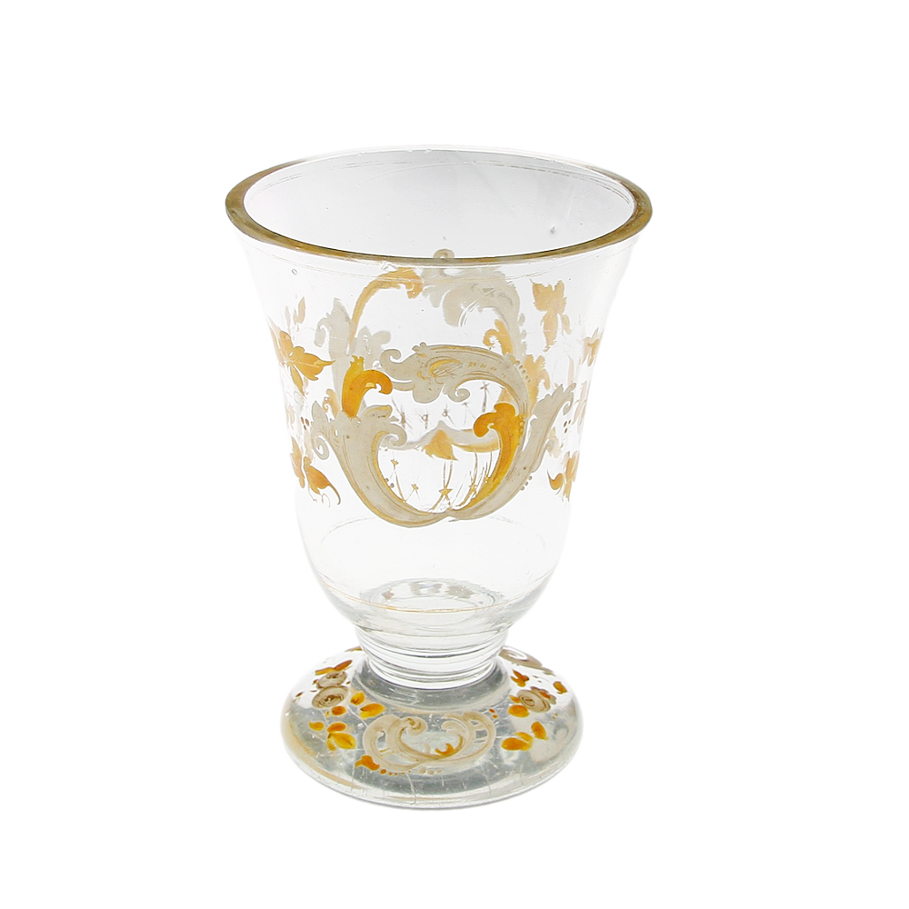 Číška na nožce vyrobená z čirého skla. Motiv růžiček a rokajových kartuší je ručně malován bílými a okrovými smalty a zlatou linkou (ta je již místy setřená). Může se jednat o českou produkci z poloviny 19. století.