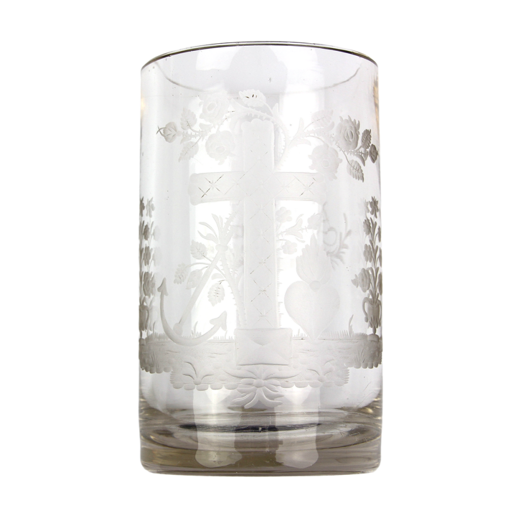 Sklenice zdobená broušeným dekorem s námětem "láska, víra, naděje" vyrobená kolem roku 1850.