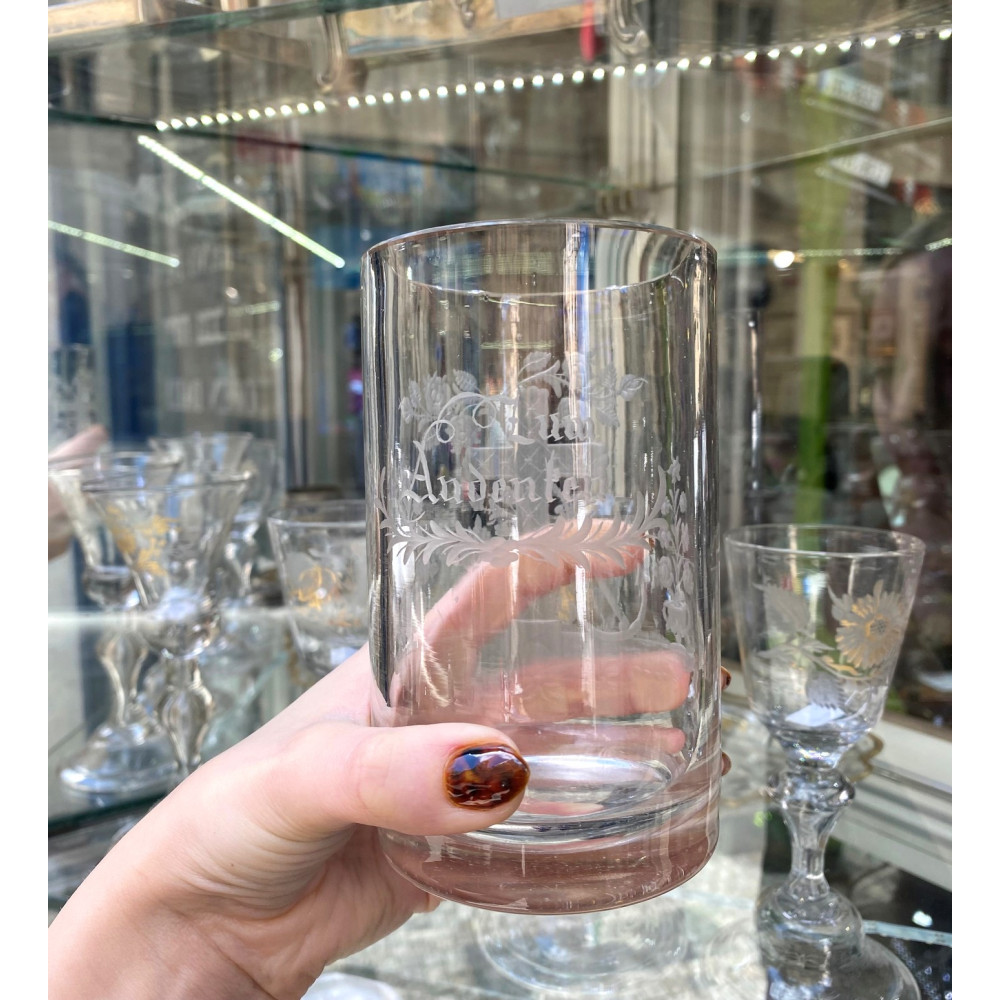 Sklenice vyrobená z bezbarvého skla zdobená broušením s monogramem "M.K."