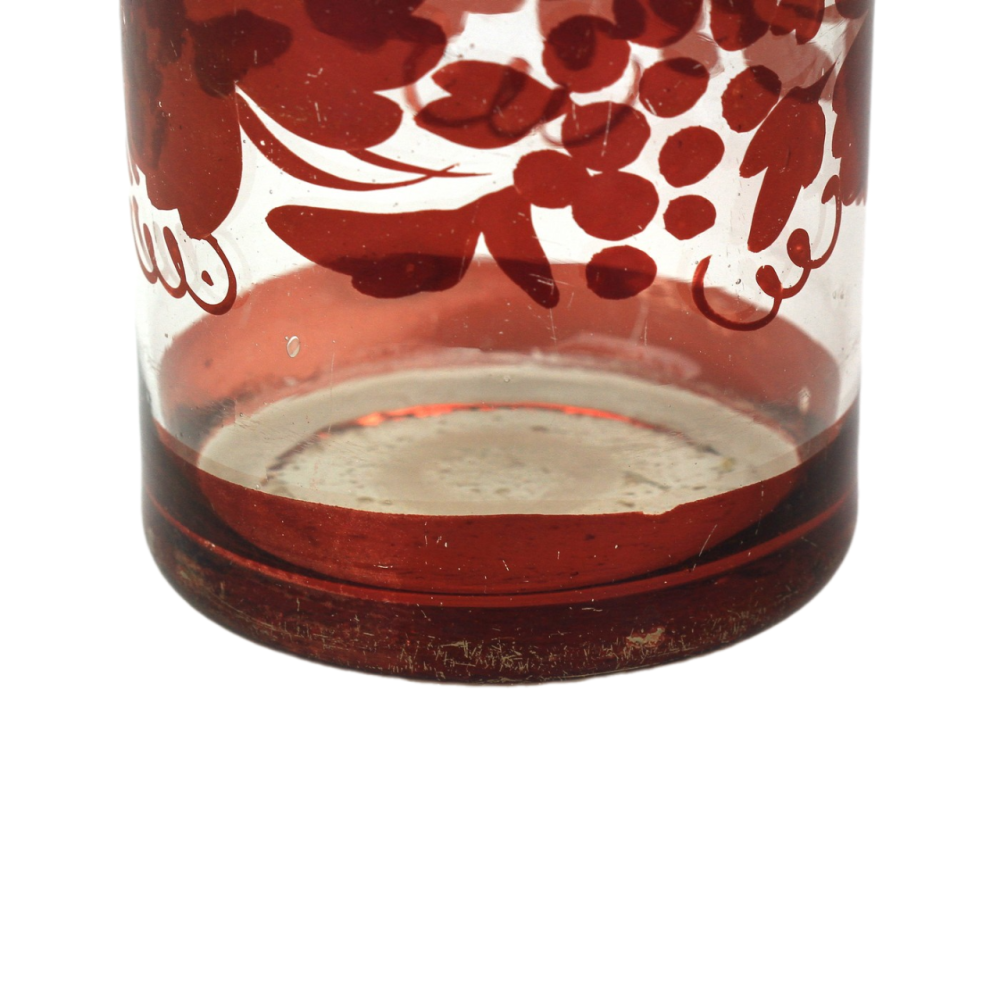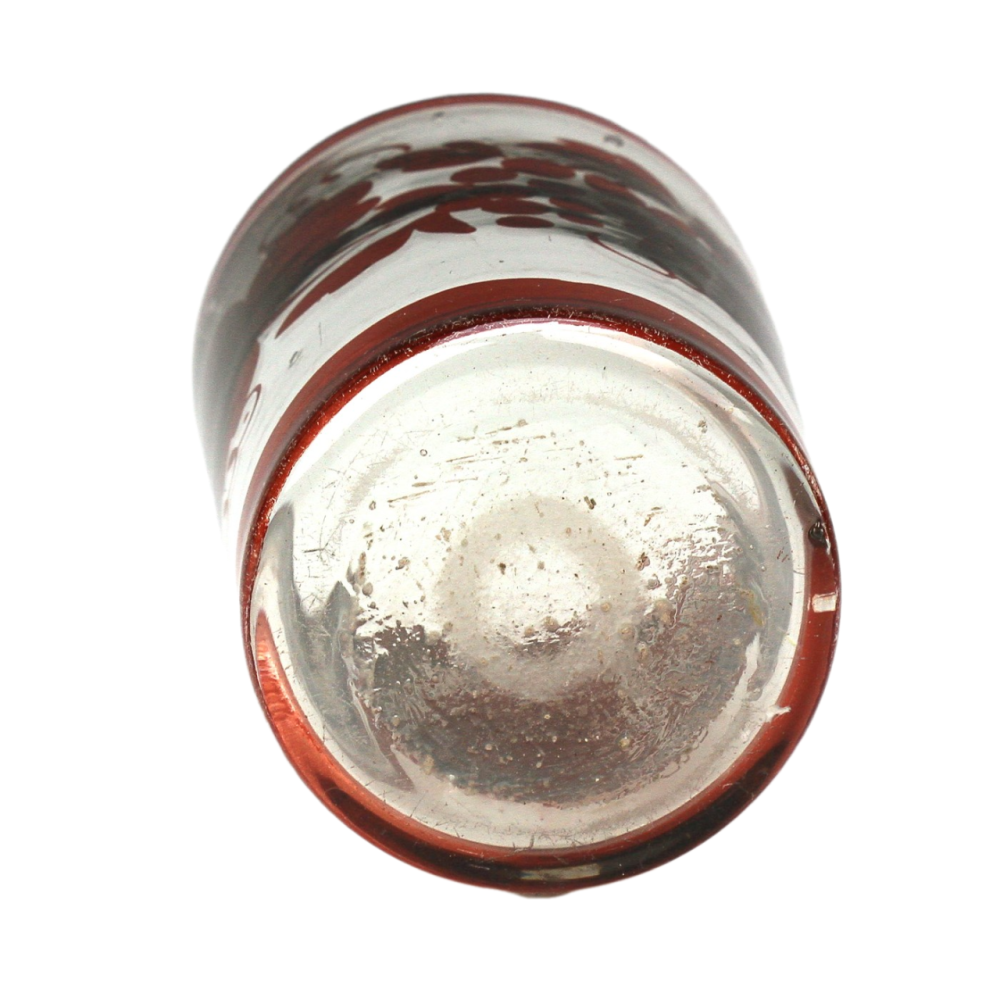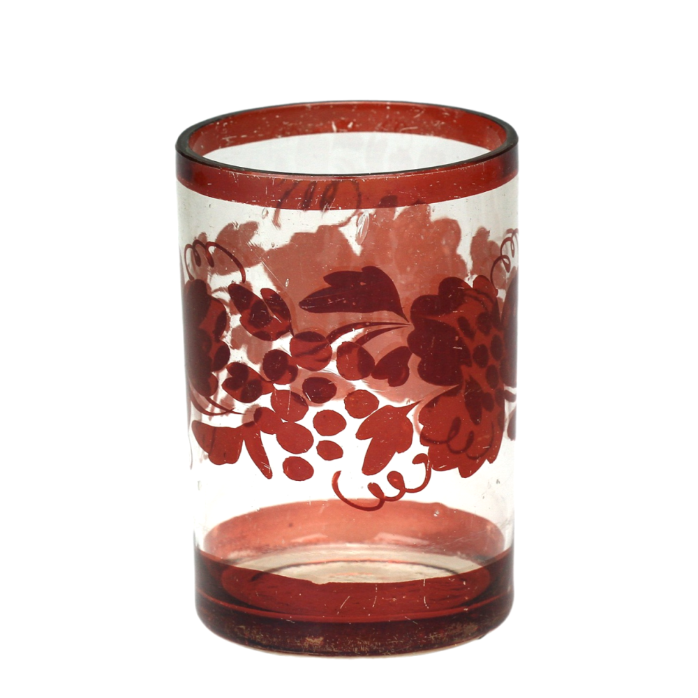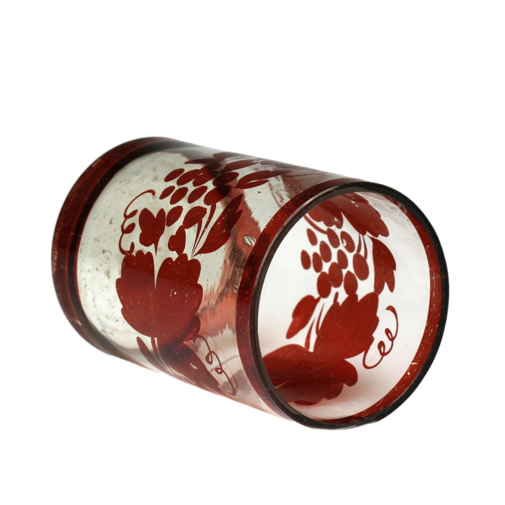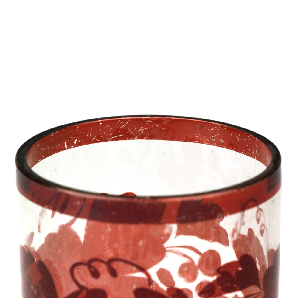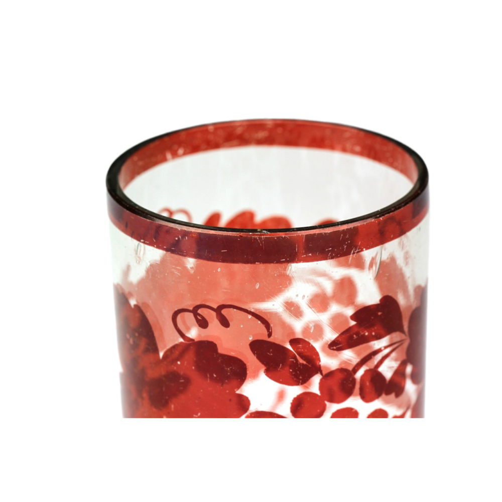 Upomínkový pohárek vyrobený v polovině 19. století z bezbarvého skla, které je broušené, řezané a malované rubínovou lazurou. Uprostřed předního medailonku se nachází nápis "Hofnung Glaube Liebe", dále motiv planoucího srdce, kříže a kotvy (symboly lásky, víry a naděje) s rostlinným dekorem po stranách.