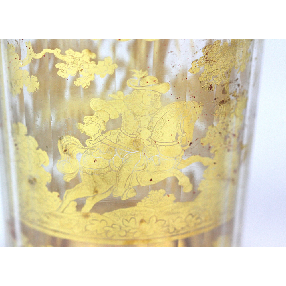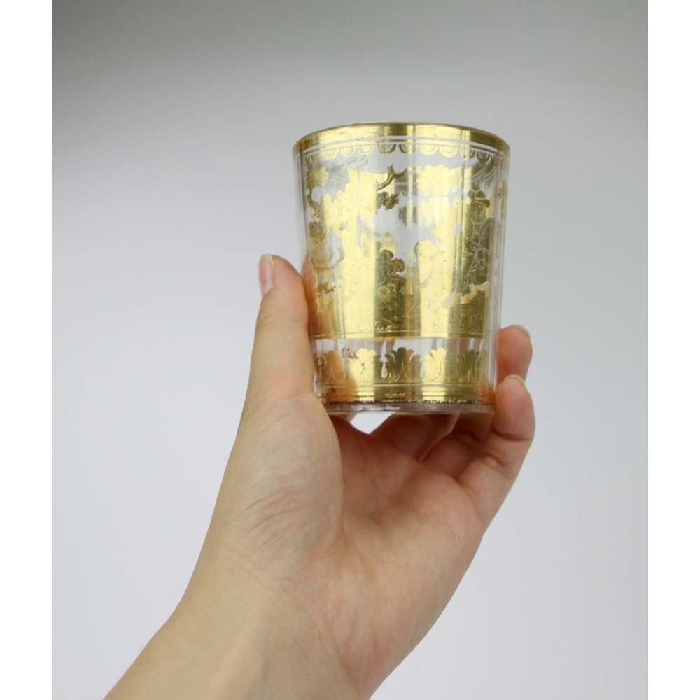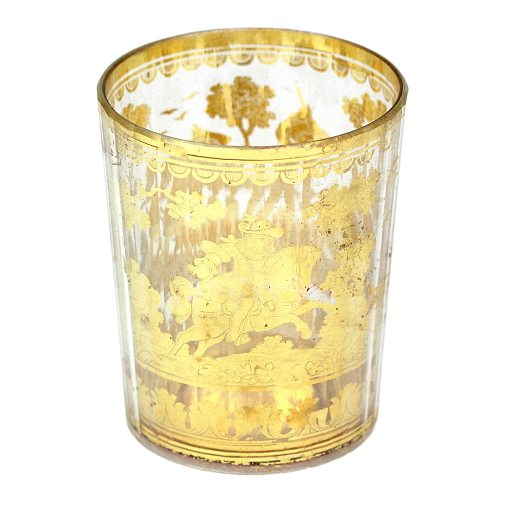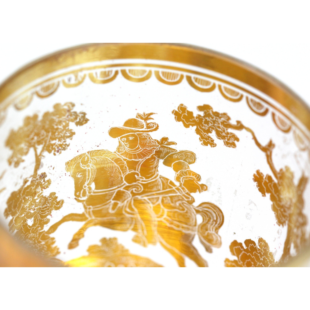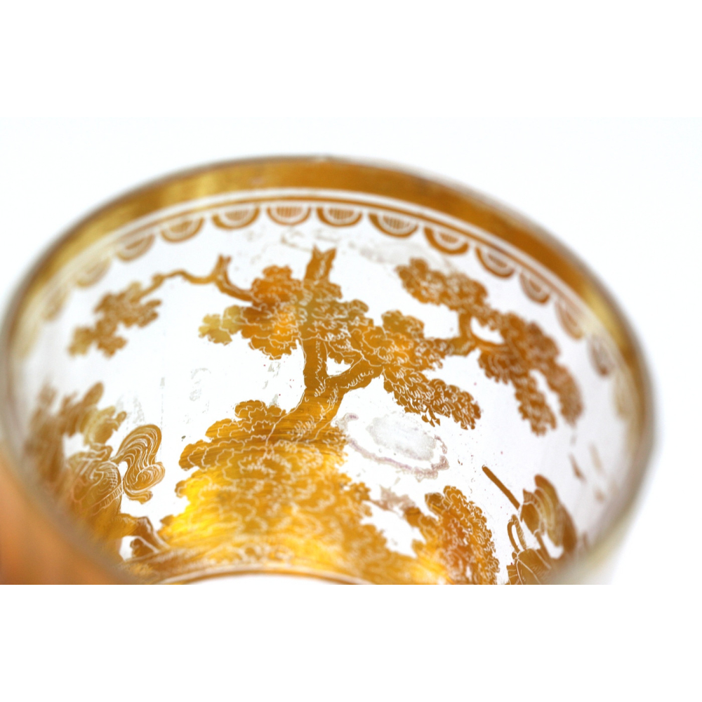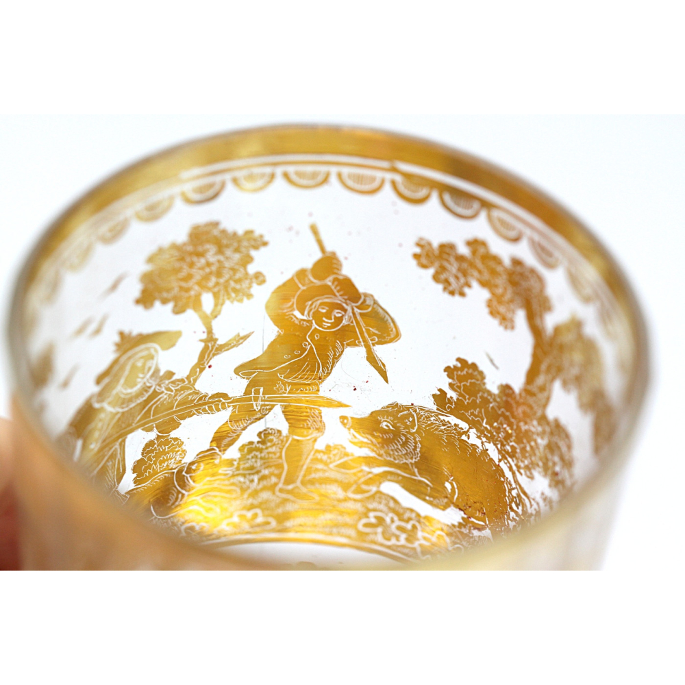 Číška, tzv. "dvojstěnka", složená ze dvou fasetově broušených lehce kónických skel vložených do sebe, mezi které je vložena zlatá fólie s proškrabávanou kresbou s námětem lovu kance. Dvojstěnné sklo z bezbarvého křišťálu bylo vyráběno kolem roku 1730 pravděpodobně v severních Čechách.