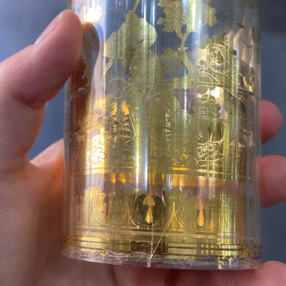 Dvojstěnka má na několika místech poškozenou zlatou fólii i zlacení. Ve skle se nachází prasklina, horní i dolní okraj nesou několik malých oťuků, chybí spodní část dna.