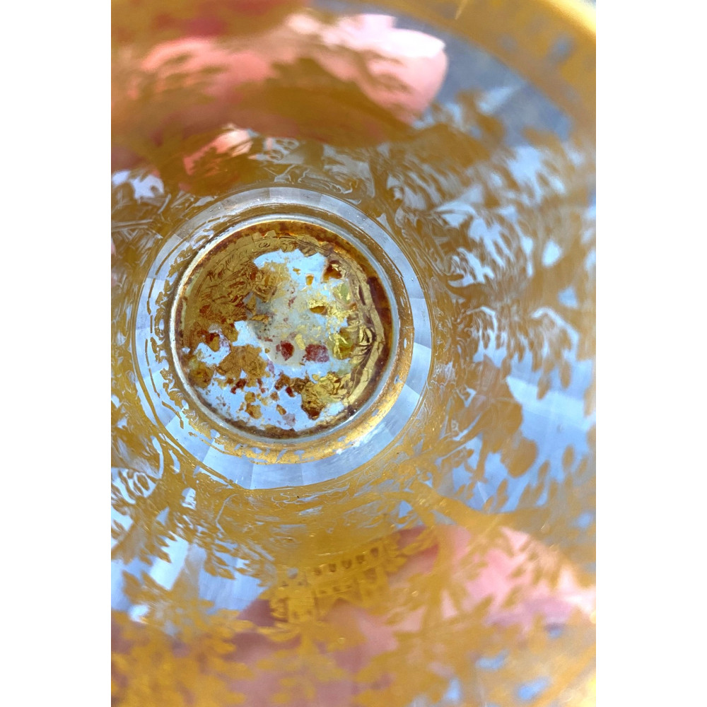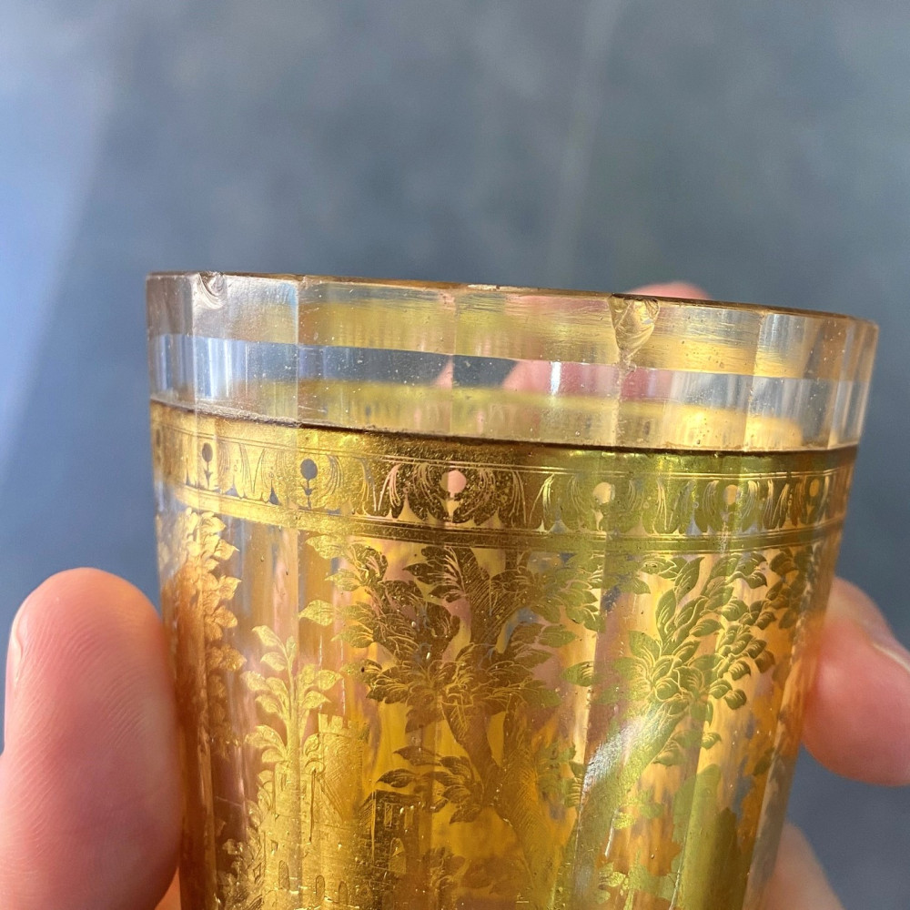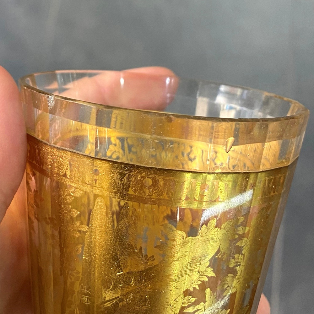 Číška, tzv. "dvojstěnka", složená ze dvou fasetově broušených lehce kónických skel vložených do sebe, mezi které je vložena zlatá fólie s proškrabávanou kresbou s námětem lovu kamzíků. Dvojstěnné sklo z bezbarvého křišťálu bylo vyráběno kolem roku 1730 pravděpodobně v severních Čechách.