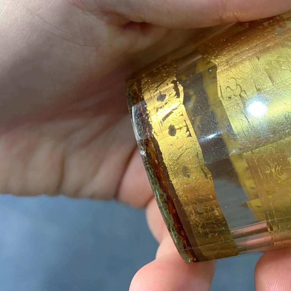 Dvojstěnka má zlacení na několika místech poškozené, horní i dolní okraj nese několik oťuků.