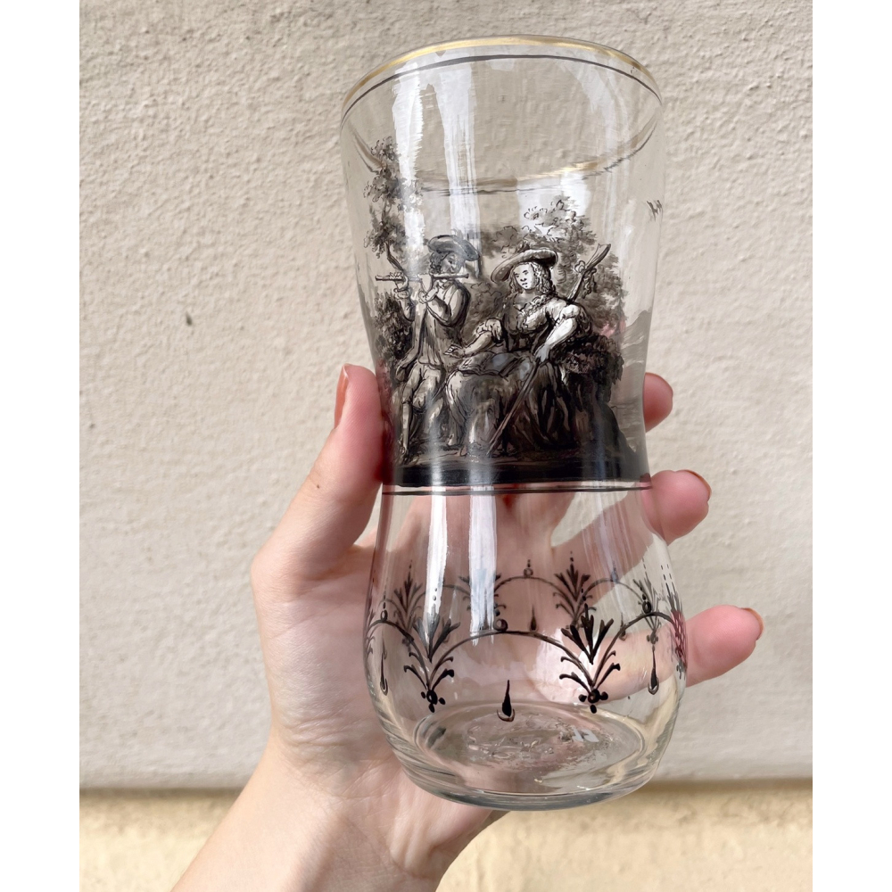 Sklenice zdobená ruční malbou loveckého motivu. Klasický příklad českého malovaného skla švarclotem a barevnými smalty pravděpodobně ze sklárny Julius Mühlhaus & Co. v Novém Boru na přelomu 19. a 20. století.