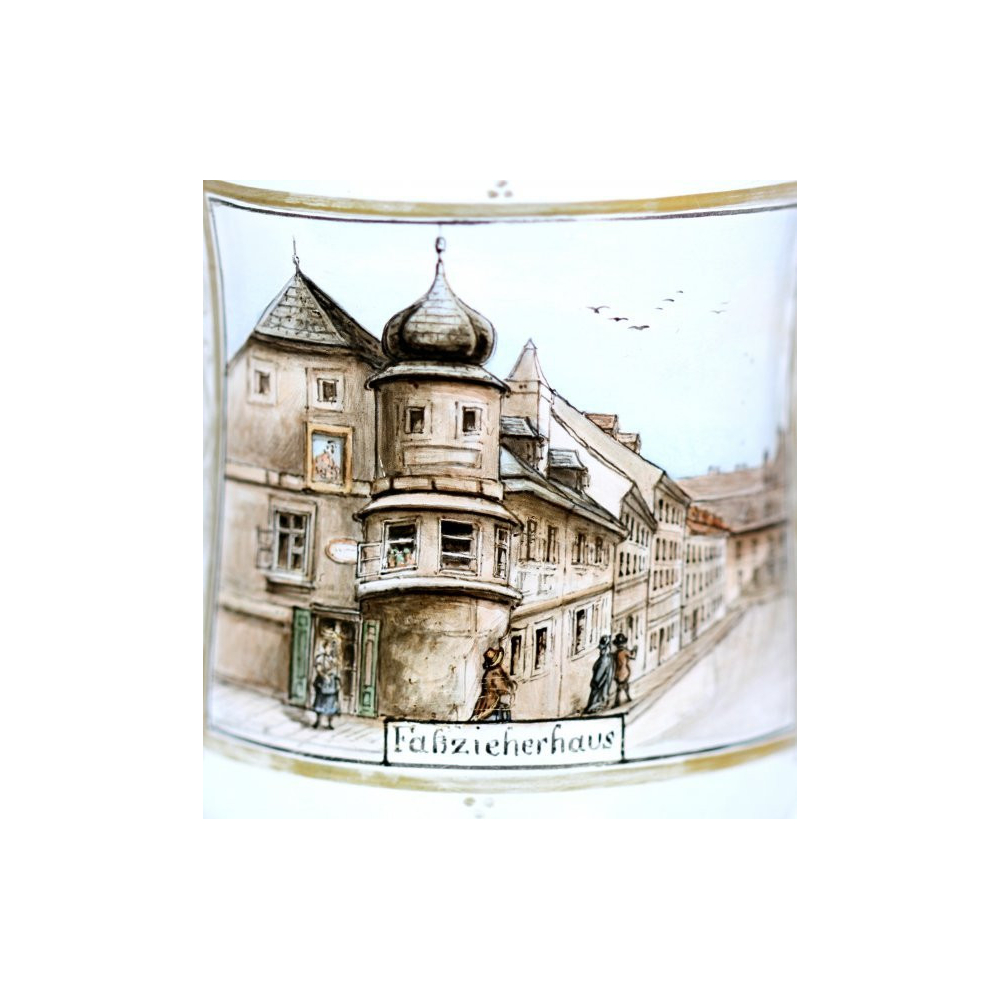 Čirá sklenice s malovanou a zlacenou vedutou Budapešti. Pohled od rušného města směrem k řece Dunaji a na hrad s nápisem "Unsere Donauziele in Pesth."Neznačeno. Tento typ skla s minuciózní malbou vedut se inspiroval vídeňskou tvorbou Antona Kothgassera (1769-1851).