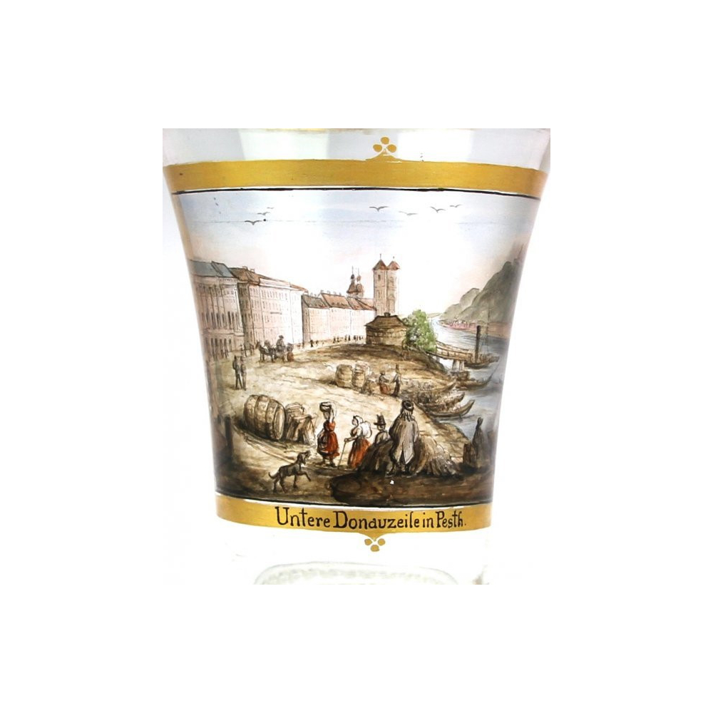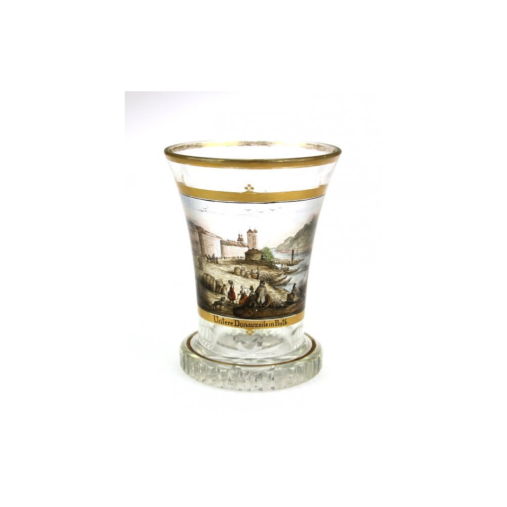 Čirá sklenice s malovanou a zlacenou vedutou Budapešti. Pohled od rušného města směrem k řece Dunaji a na hrad s nápisem "Unsere Donauziele in Pesth."Neznačeno. Tento typ skla s minuciózní malbou vedut se inspiroval vídeňskou tvorbou Antona Kothgassera (1769-1851).