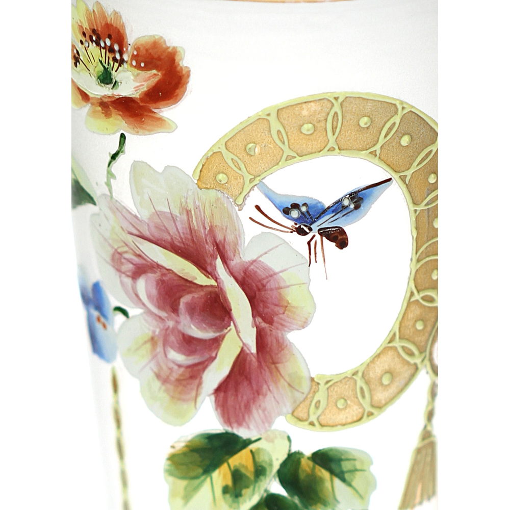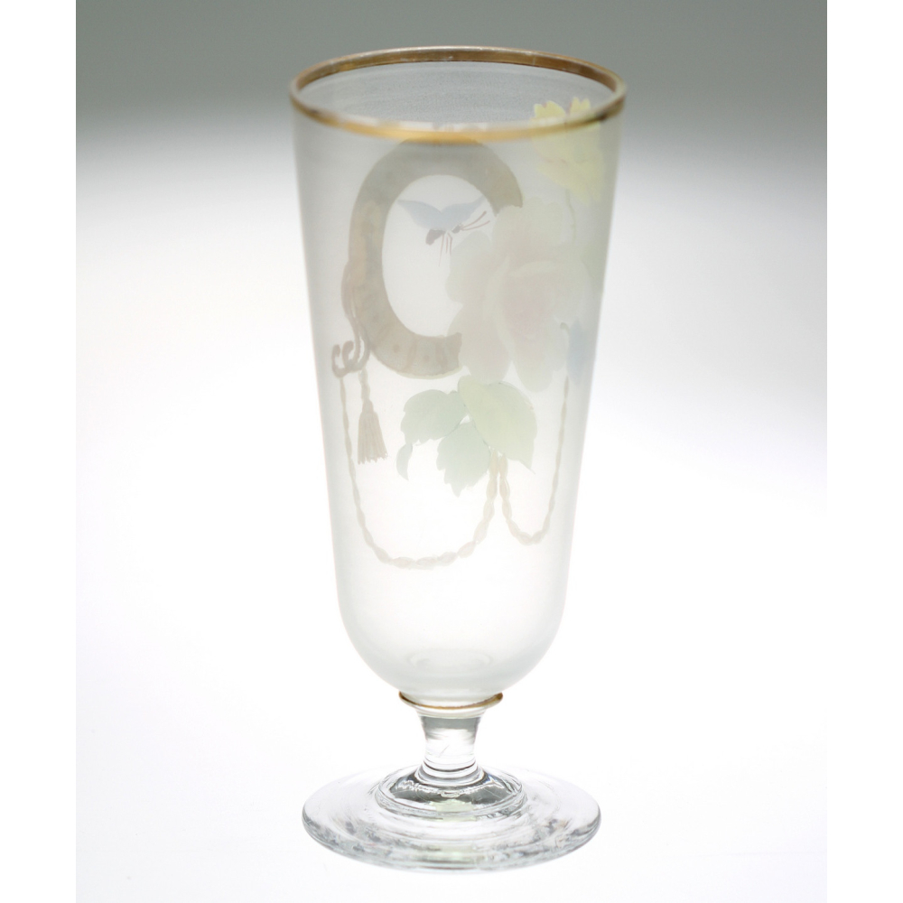 Atraktivní secesní sklenice na nožce vyrobená kolem roku 1905, ručně malovaná s motivem květin a motýla. Sklenice nese nepatrné stopy používání, na okraji má malý oťuk.