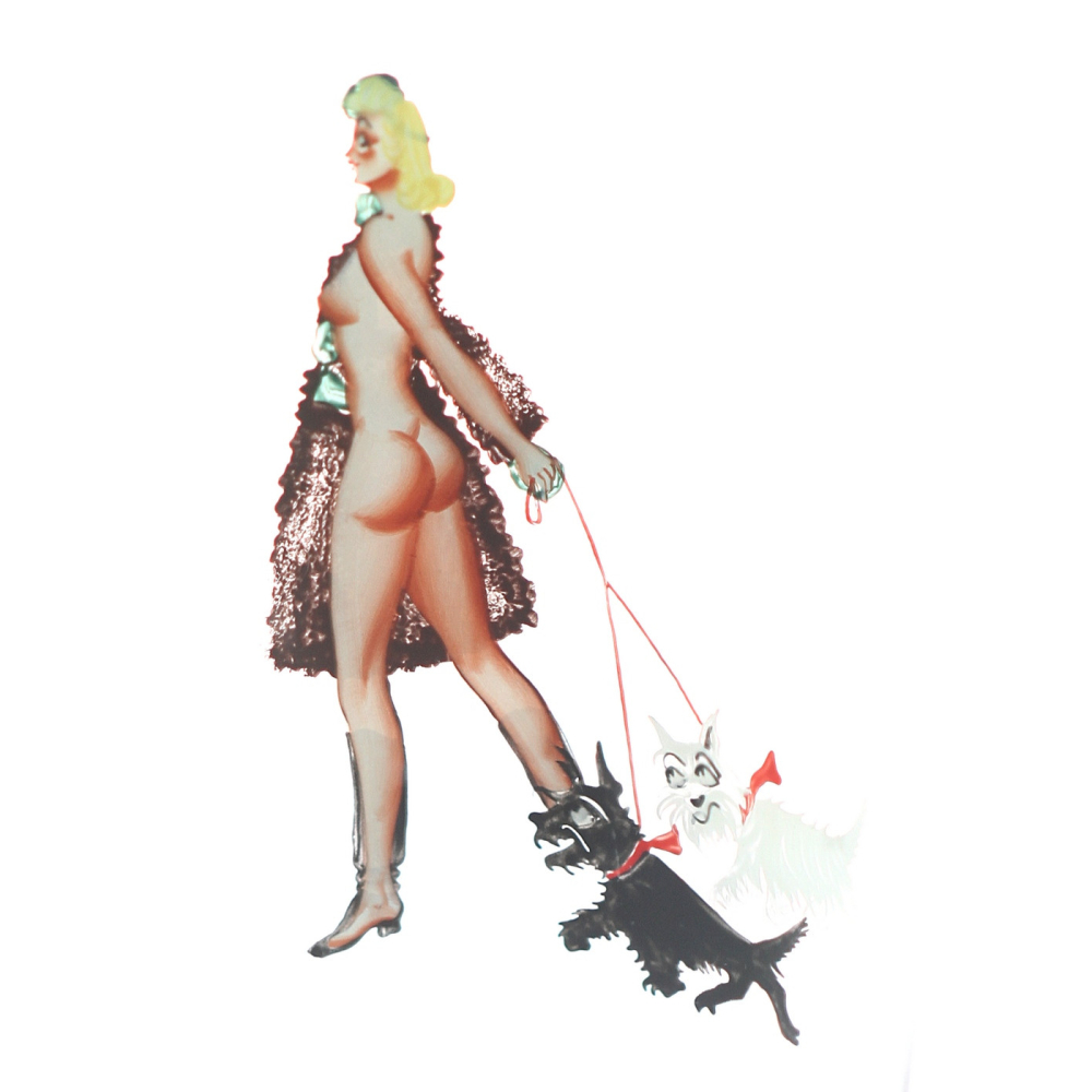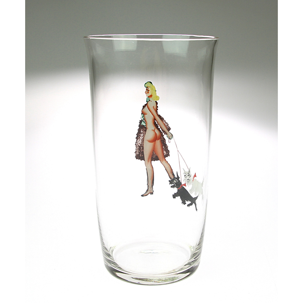 Sklenice vyrobená z čirého skla s ručně malovaným motivem ženy venčící skotské teriéry, na vnější straně sklenice namalovaná s oblečením a na vnitřní straně bez.