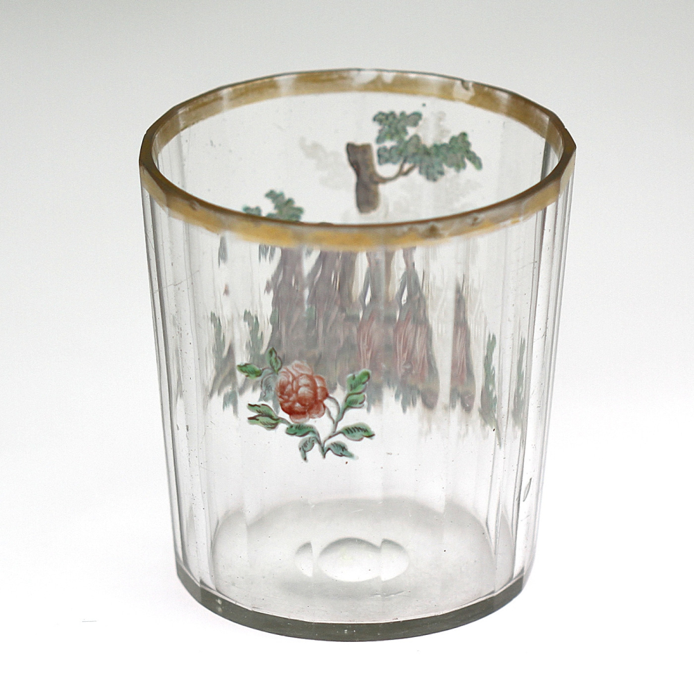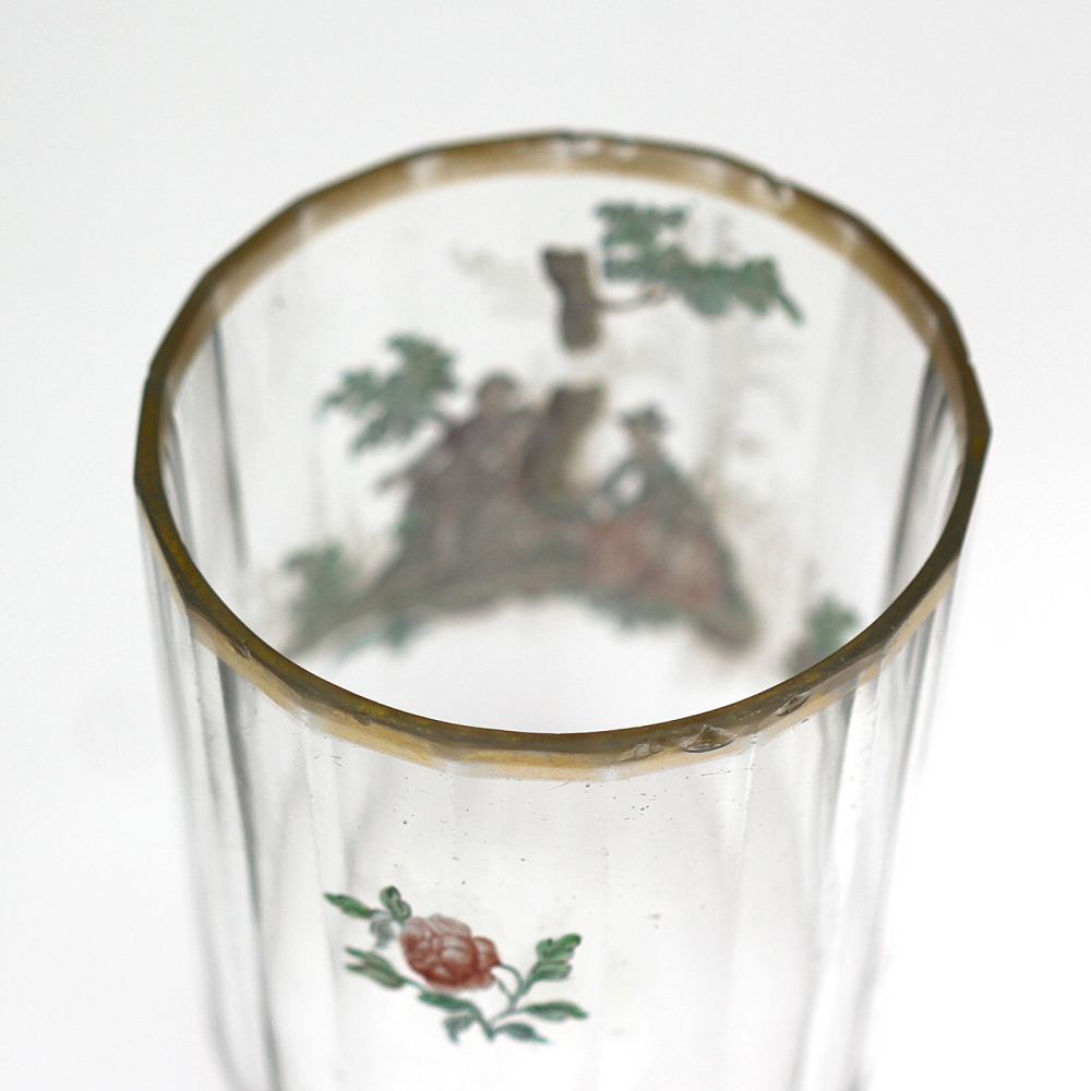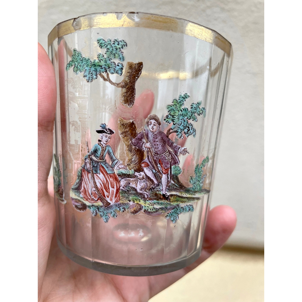 Kónická číška vyrobená v období rokoka mezi lety 1760 - 1780 v Čechách z bezbarvého broušeného skla. Nádoba je ručně malovaná zlatem a pestrými smalty s námětem galantního páru odpočívajícího při lovu.