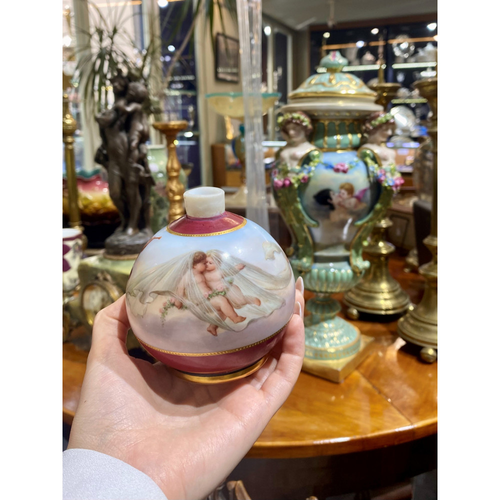 Detailně zpracovaná porcelánová figura znázorňující mladého muže s věncem ve vlasech upleteného z podzimního listí. V jedné ruce drží srp a druhou rukou se opírá o roh hojnosti plný sklizených plodů ovoce a zeleniny. Muž je částečně zahalen v růžovo modrém plášti připomínajícím antický oděv. Podstavu zdobí rostlinný motiv s barevnými plastickými květy,...