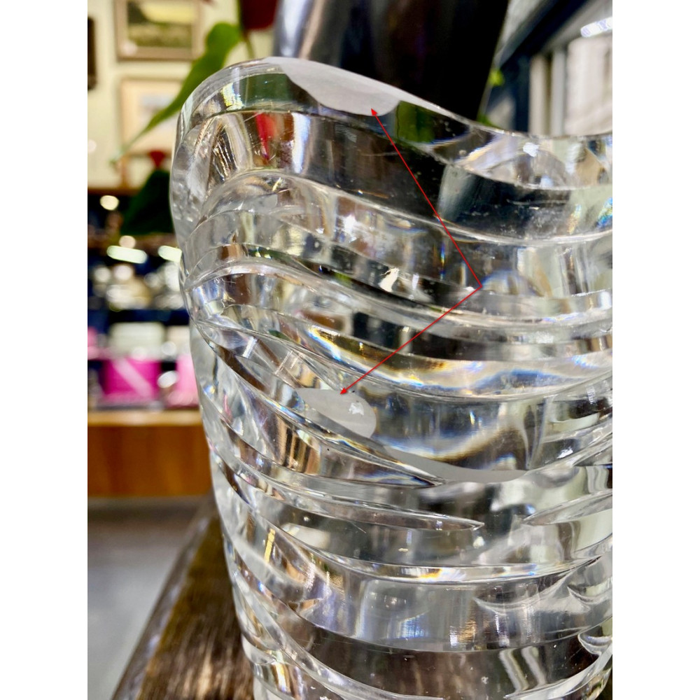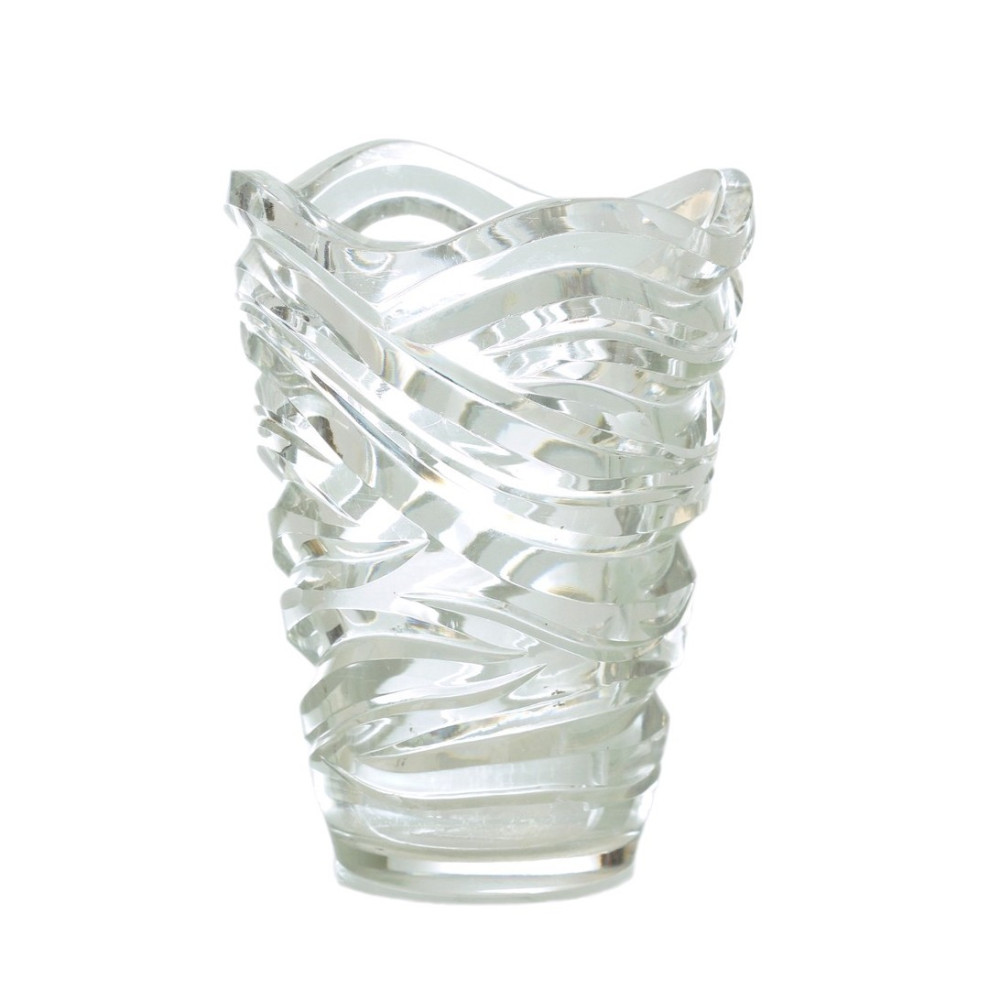 Designově zajímavá váza ve tvaru válce z čirého skla povrchově upravená barevnými lazurami.