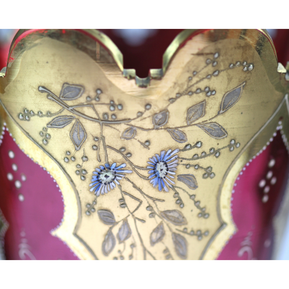 Váza vyrobená z bezbarvého skla, které je podjímané růžovým rosalinovým sklem. Zdobeno ruční malbou bílými a modrými emaily a zlatem.