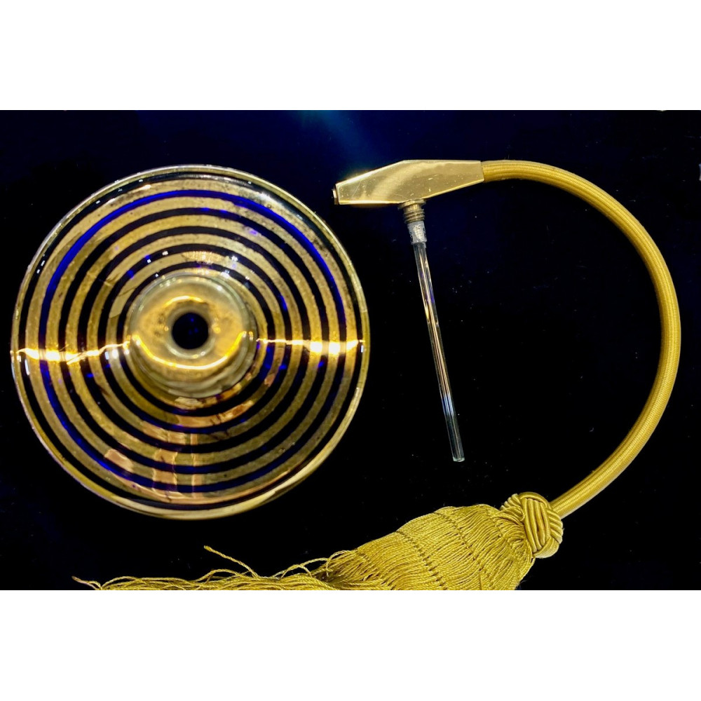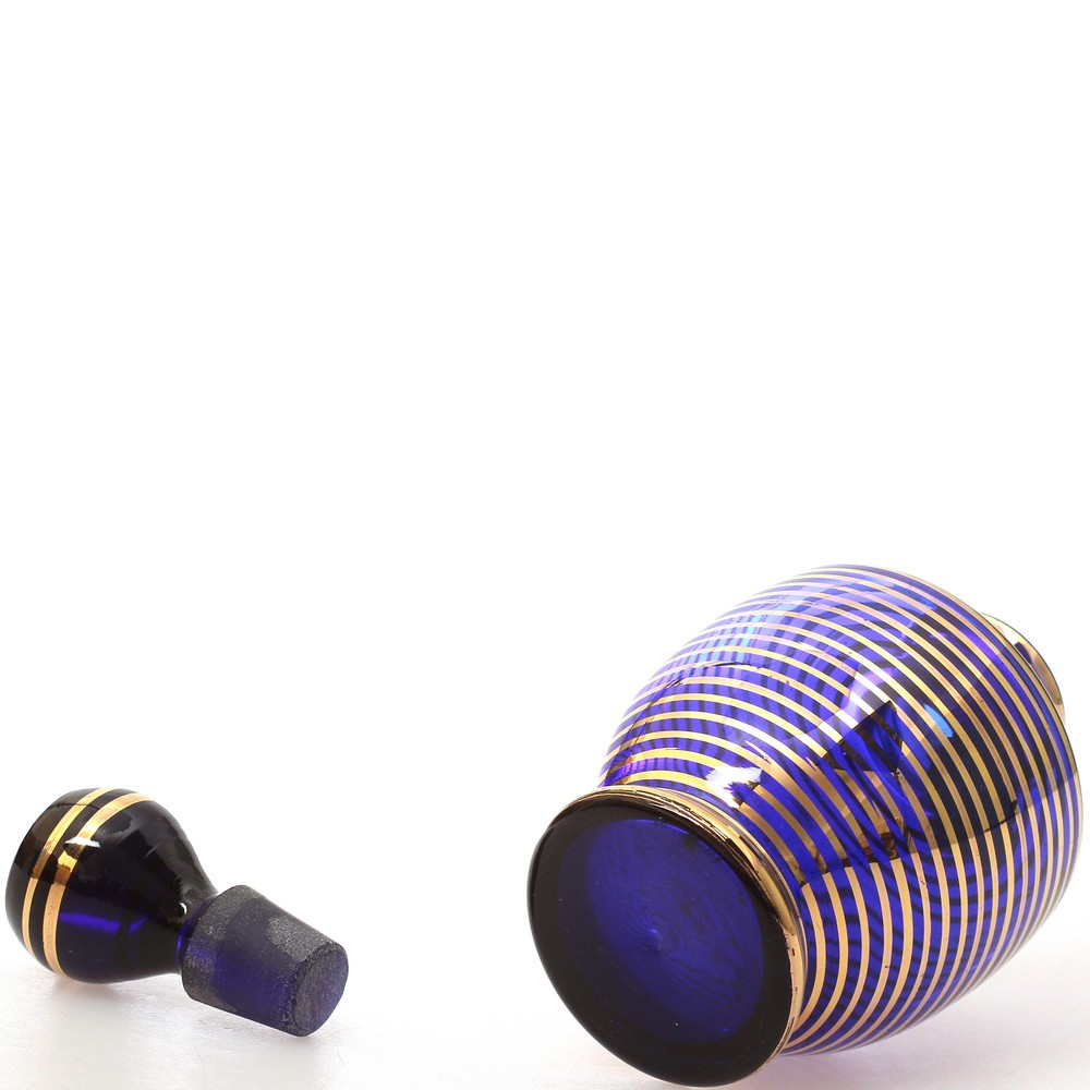 Toaletní souprava zahrnuje dózu s víčkem, karafku a plně funkční flakon na parfém. Materiálem je kobaltové sklo zdobené zlacením. Česká produkce z 60. let 20. století.