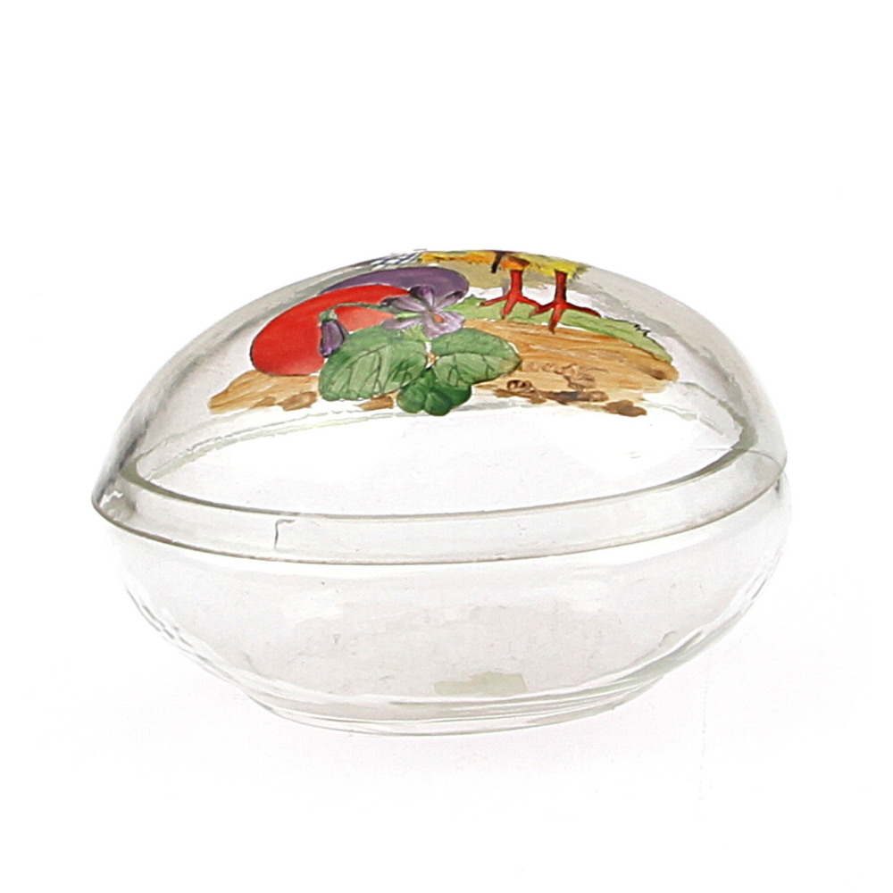 Dóza vyrobená z čirého skla ve tvaru vejce na víčku s malovaným velikonočním motivem.