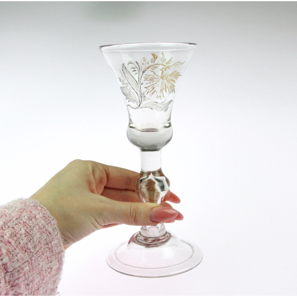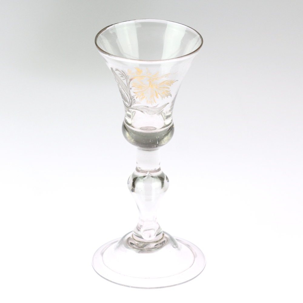 Číše na noze vyrobená z bezbarvého skla, broušeného a řezaného v Harrachově kolem roku 1790. V medailonku na přední straně nádoby se nachází monogram majitele, zřejmě "JSC".