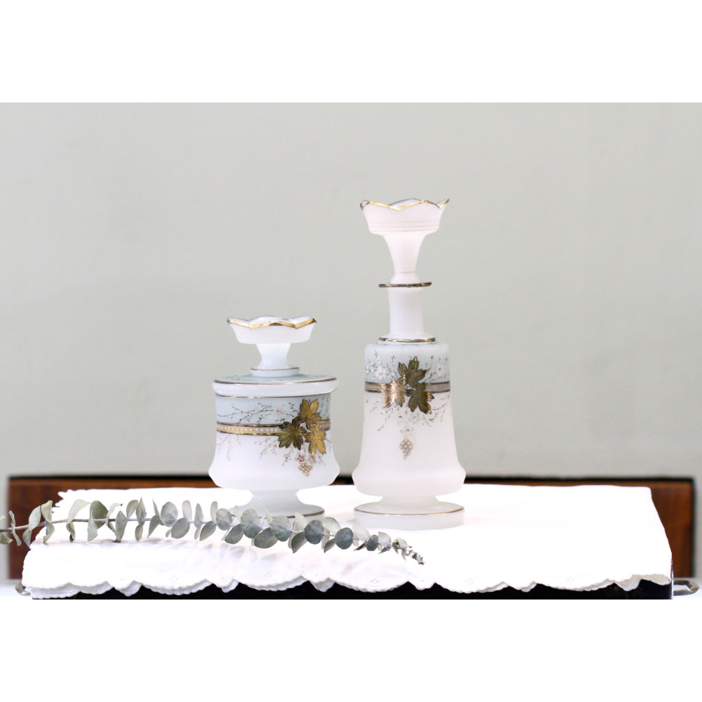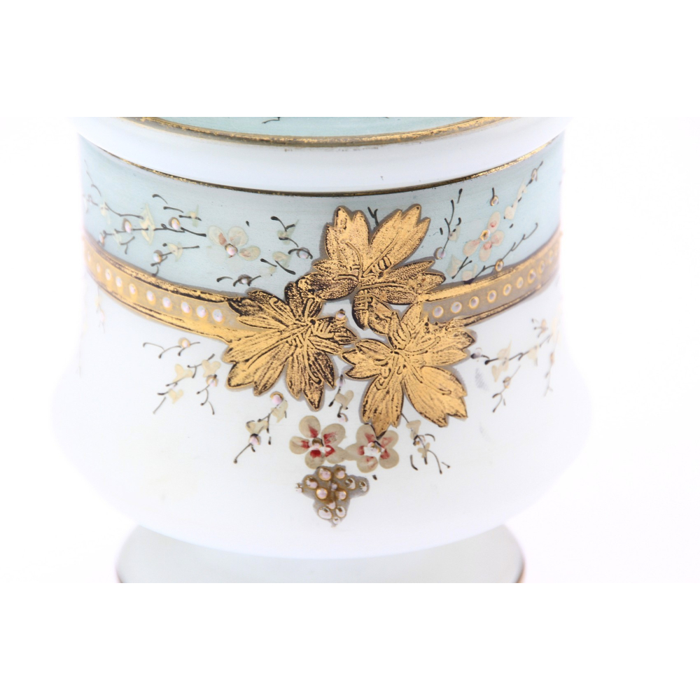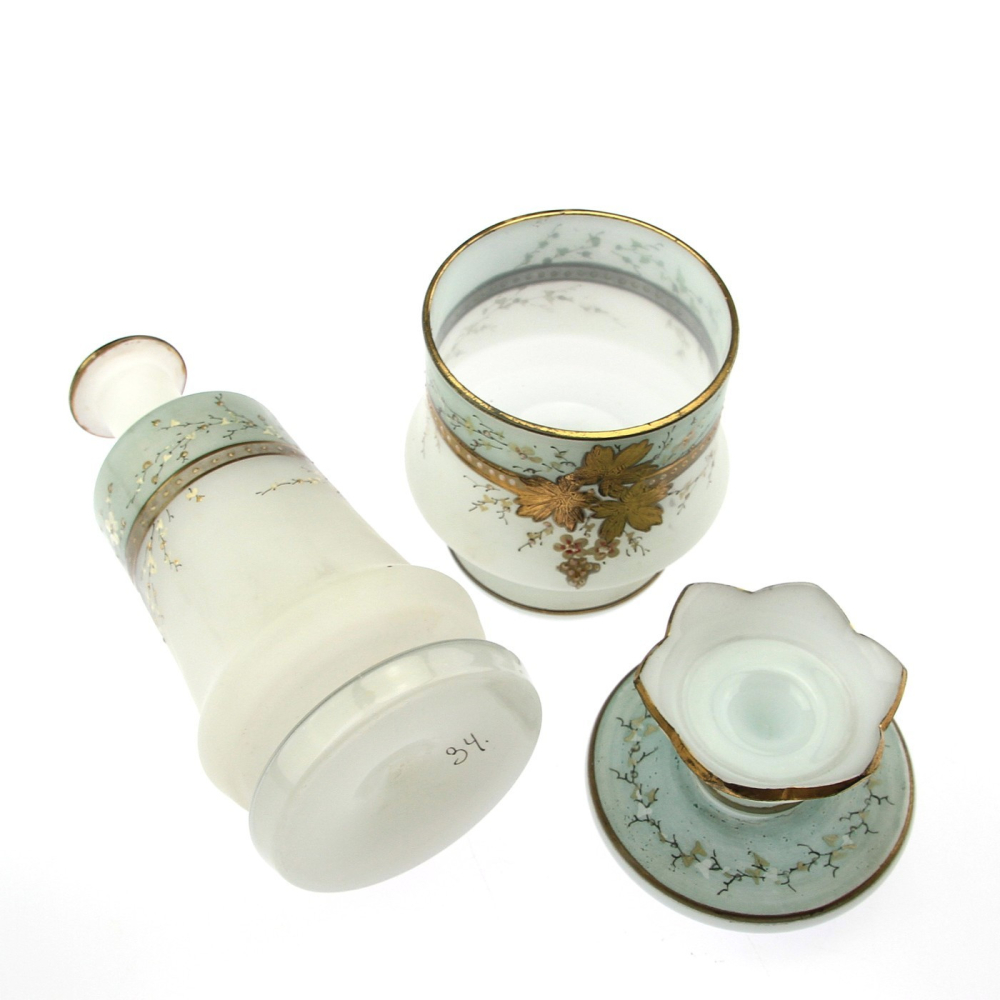 Karafa vyrobená z čirého skla, zdobená nálepy z rozalinového skla v Benátkách v 2. polovině 19. století.Karafa je ve výborném stavu. Oťuk na spodní části zátky.