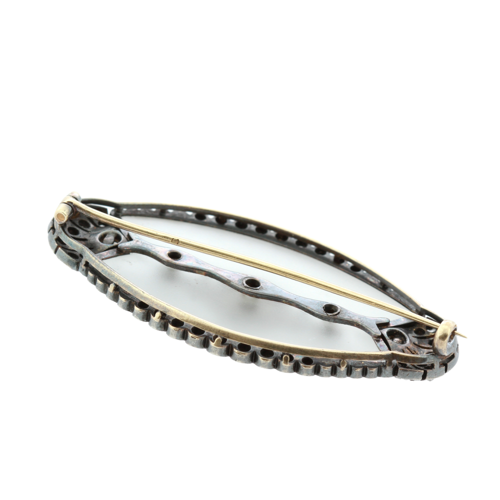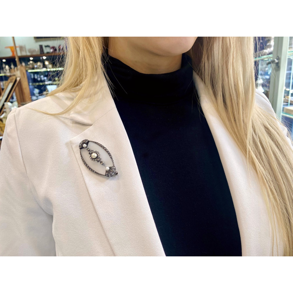 Oválná brož zhotovená ze žlutého 14karátového zlata a ze stříbra. Jejím hlavním prvkem je matovaný horský křišťál v kombinaci s perlami a diamanty routového brusu. Všechny použité kameny a perly jsou přírodního původu. Brož byla vyrobena pravděpodobně v letech 1900-1920. Opuncována ve Vídni rakousko-uherským puncem "liška".