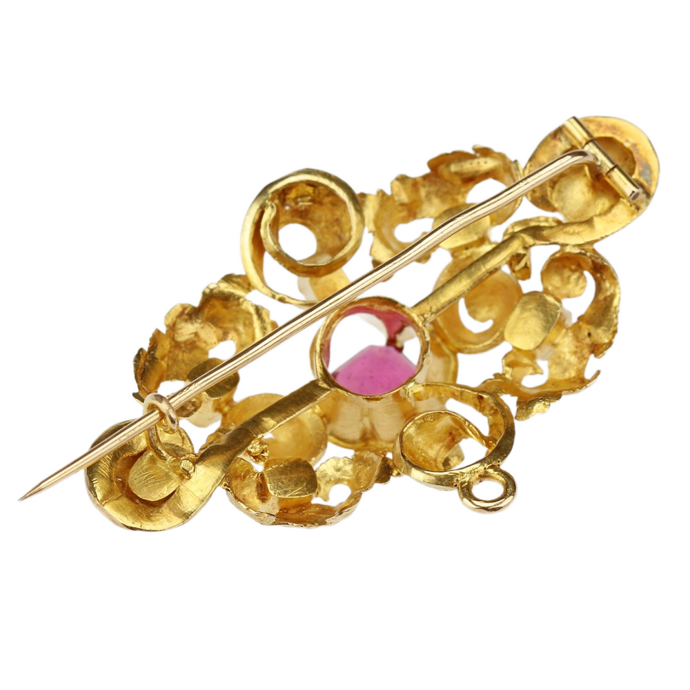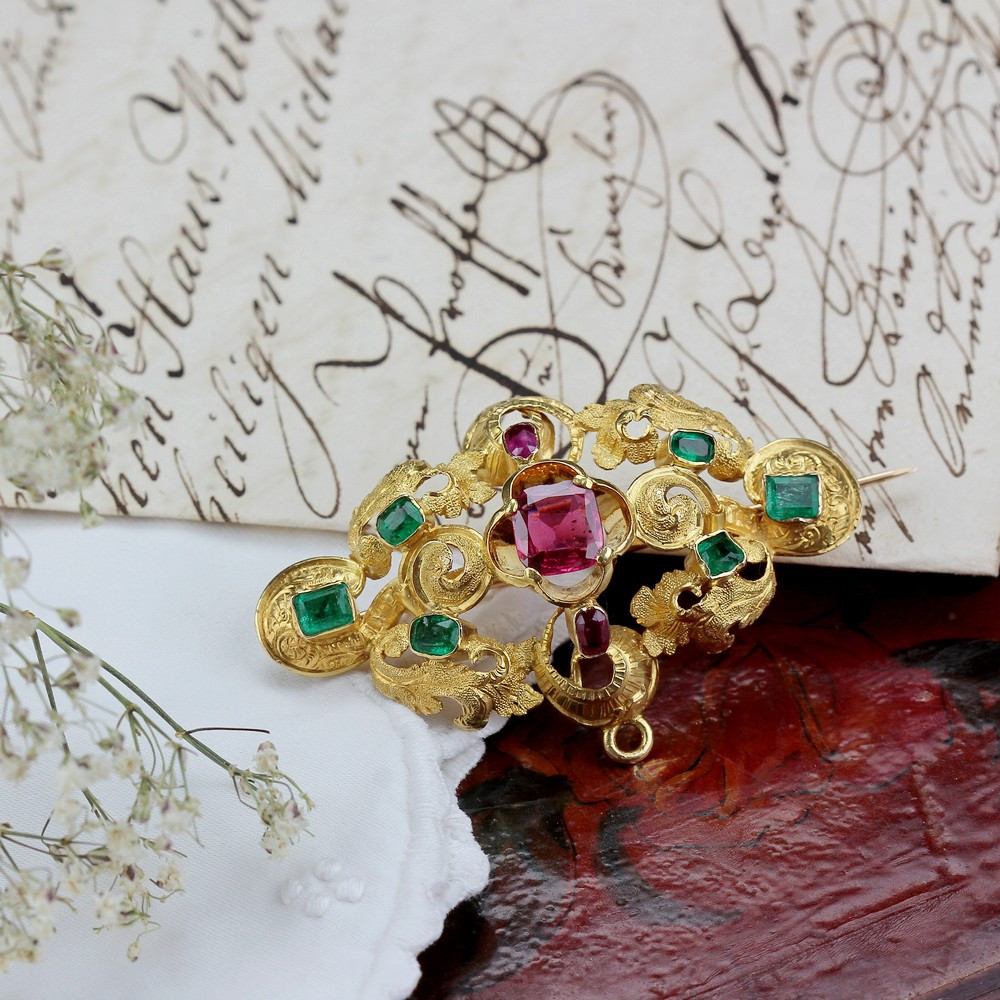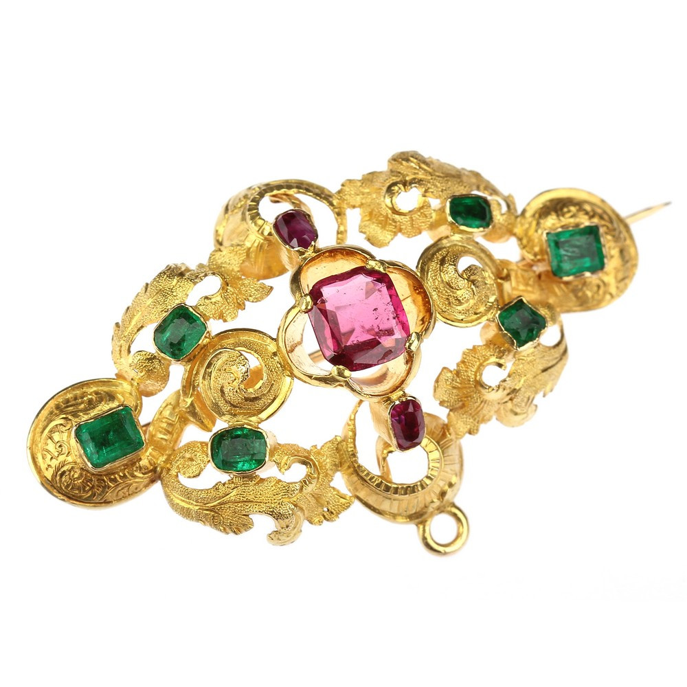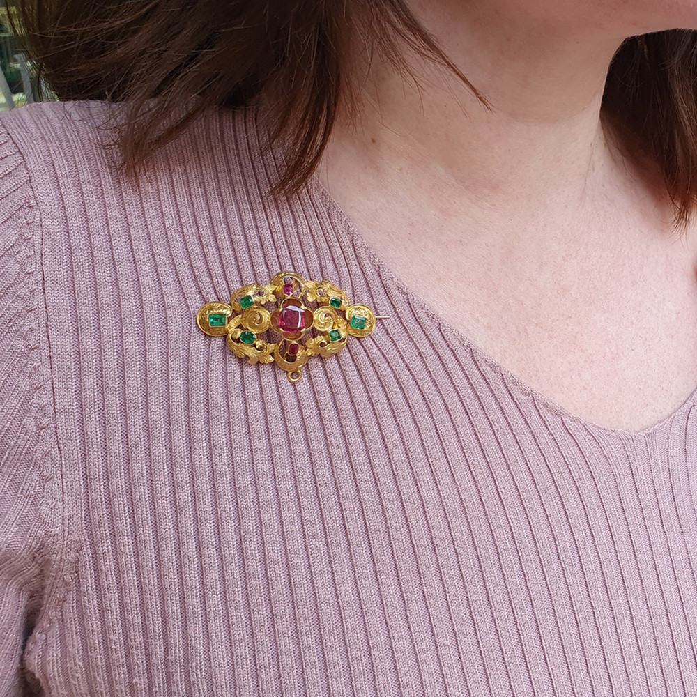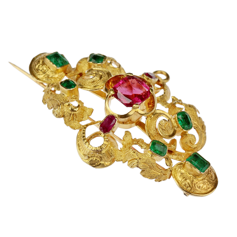 Zlatá druhorokoková brož s drahými kameny