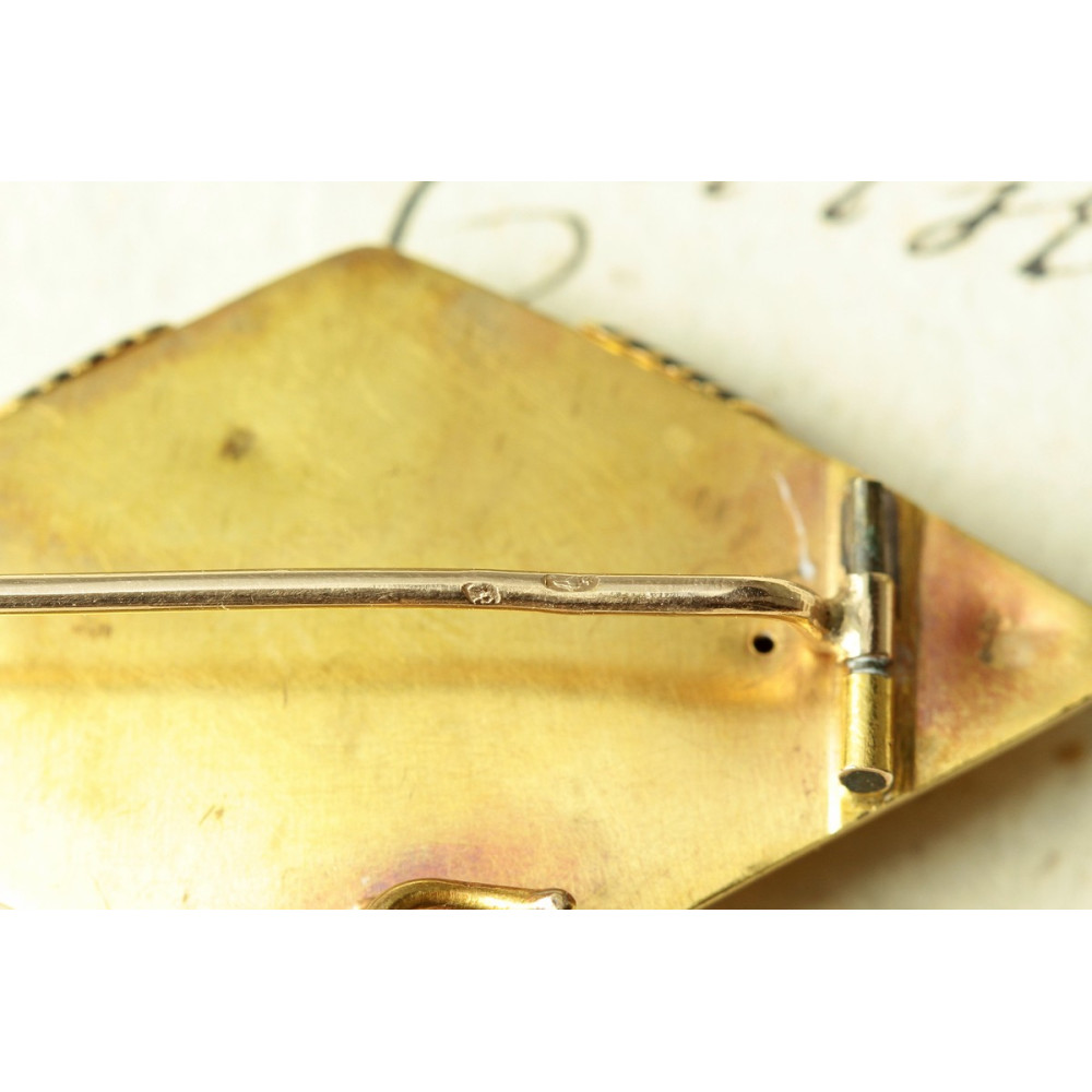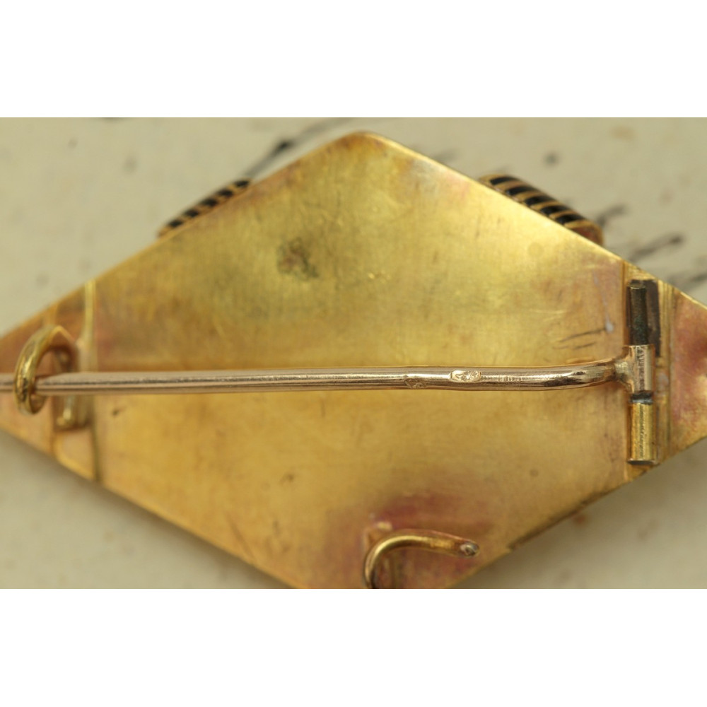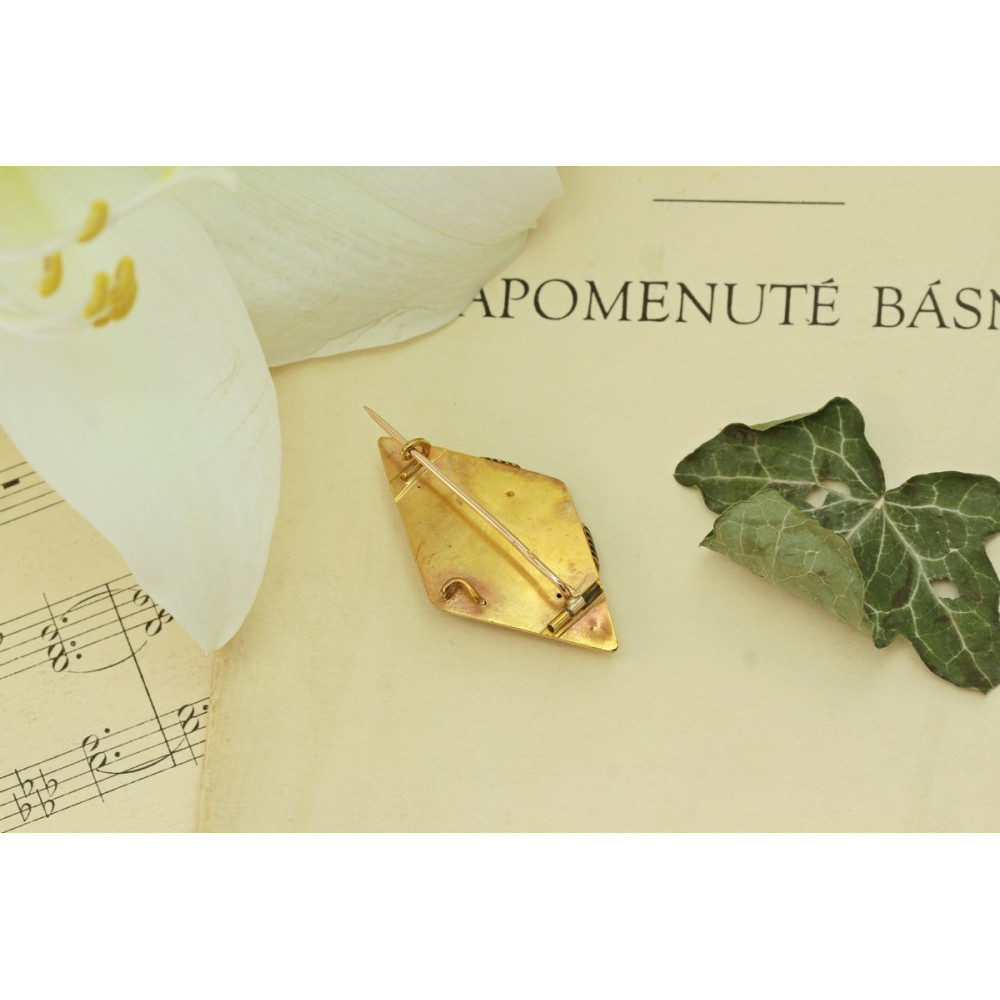 Brož zhotovená ze žlutého 14karátového zlata se třemi přírodními tyrkysy a černým smaltem. Označena rakousko-uherským puncem "liška" mezi lety 1867-1872 a mistrovskou značkou "GA".