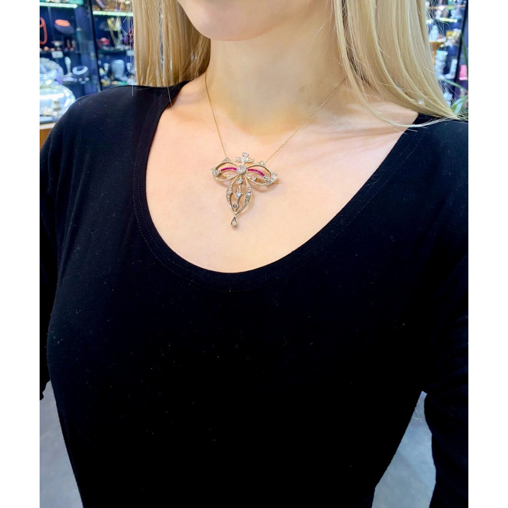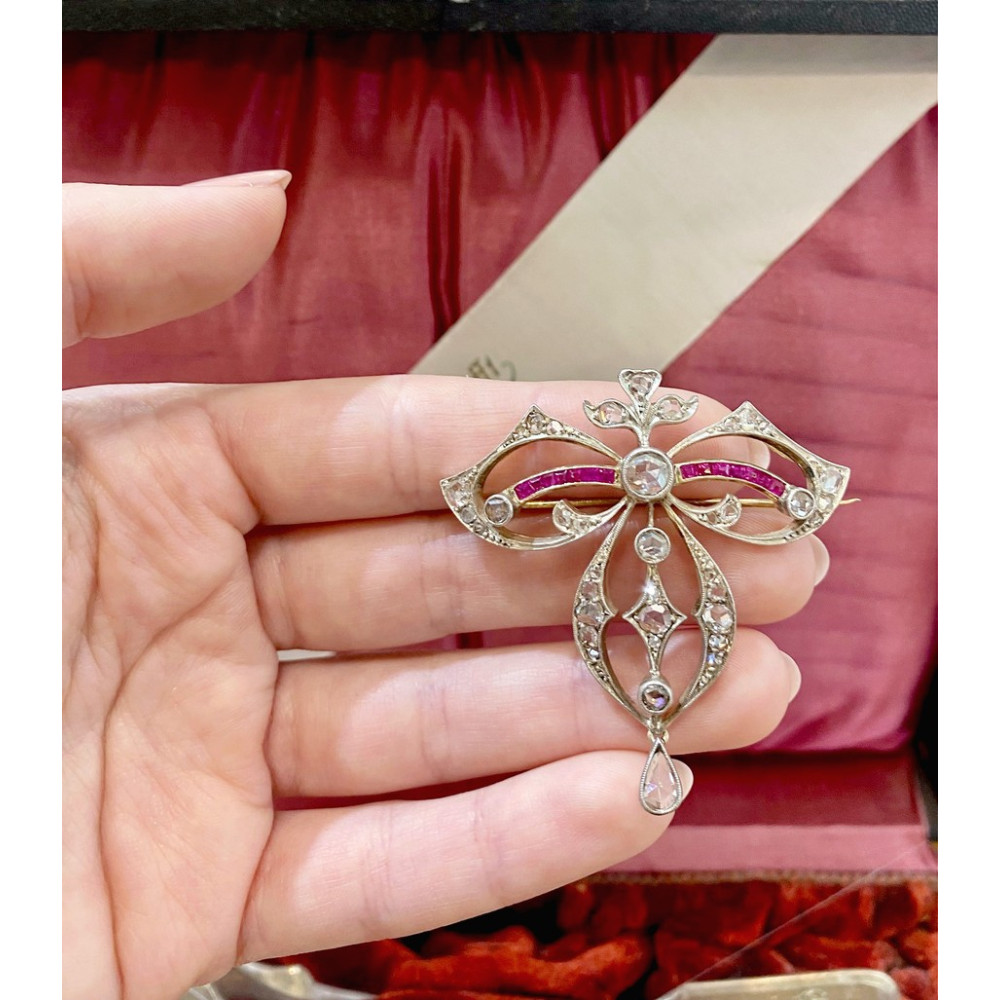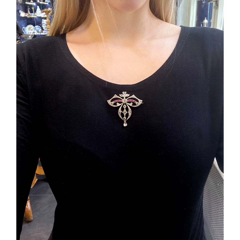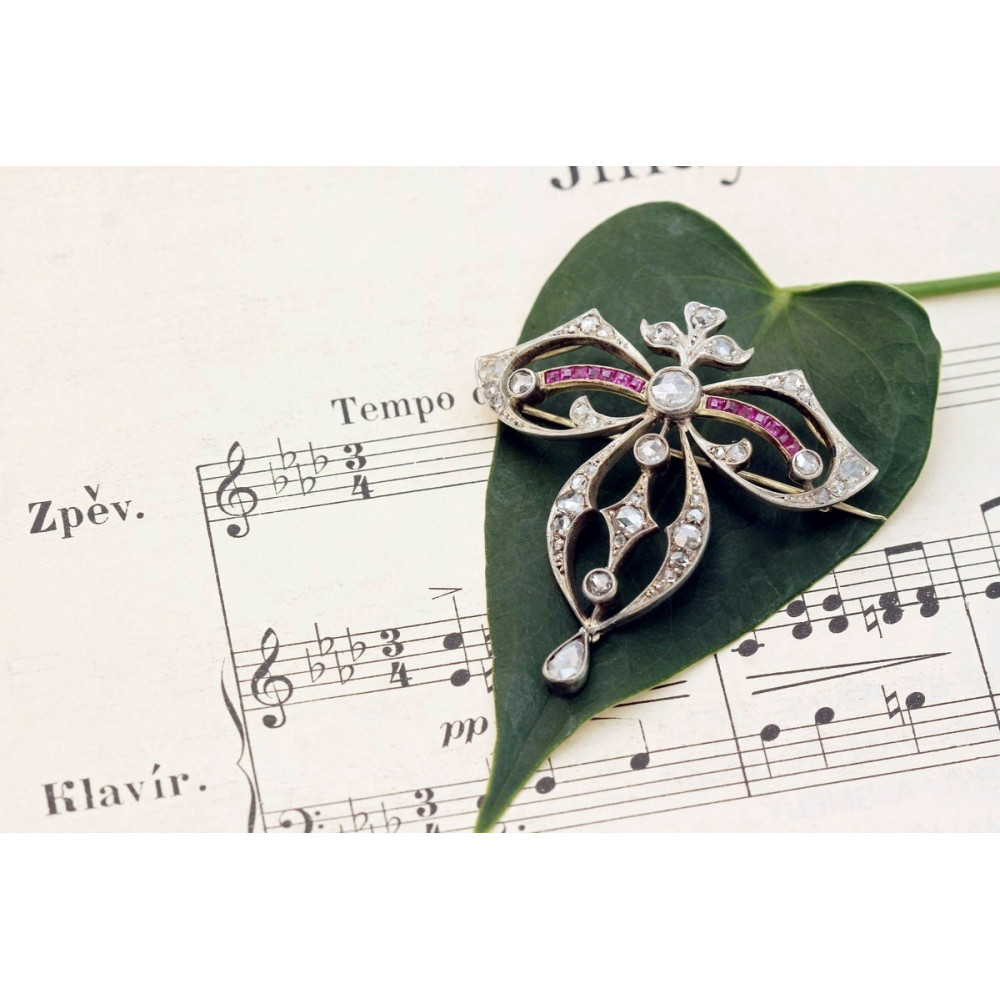Brož vyrobena ze žlutého 14karátového zlata ve stylu Belle Époque pochází přibližně z počátku 20. století. Přední strana je postříbřena a je do ní zasazeno 38 přírodních diamantů routového brusu. Výrazným barevným prvkem jsou pro svoji dobu typické syntetické rubíny v počtu 14 kusů.
