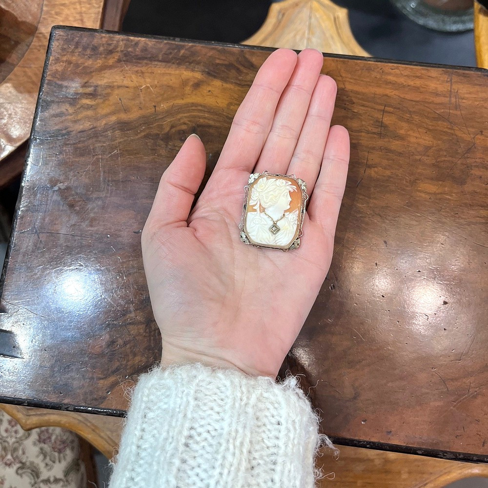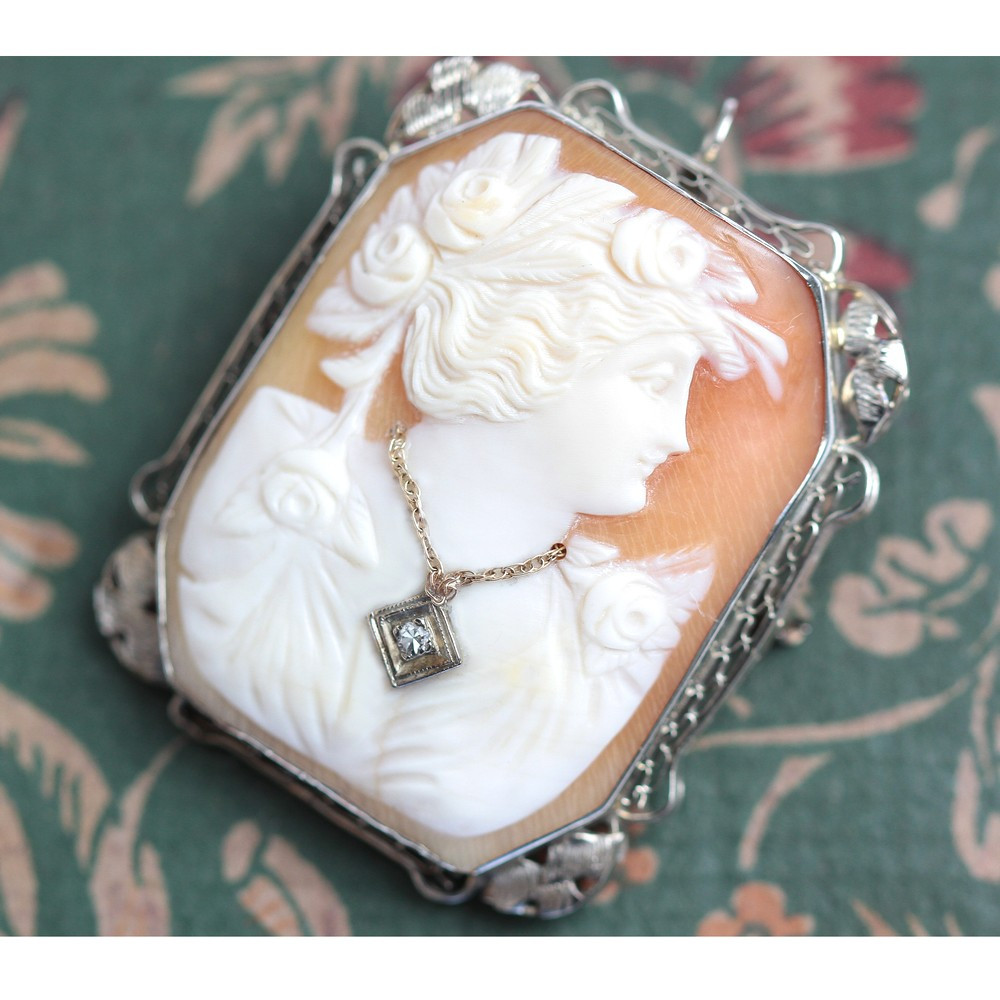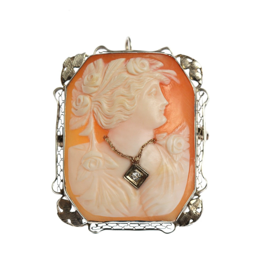 Mušlová kamej s profilem dámy osazená v rámečku z bílého 14karátového zlata. Šperk je možné nosit jako brož i přívěs.