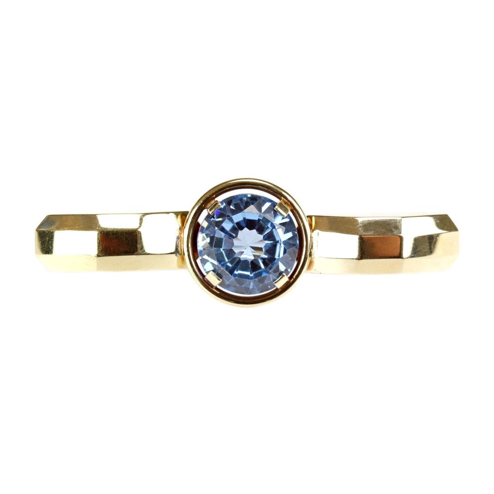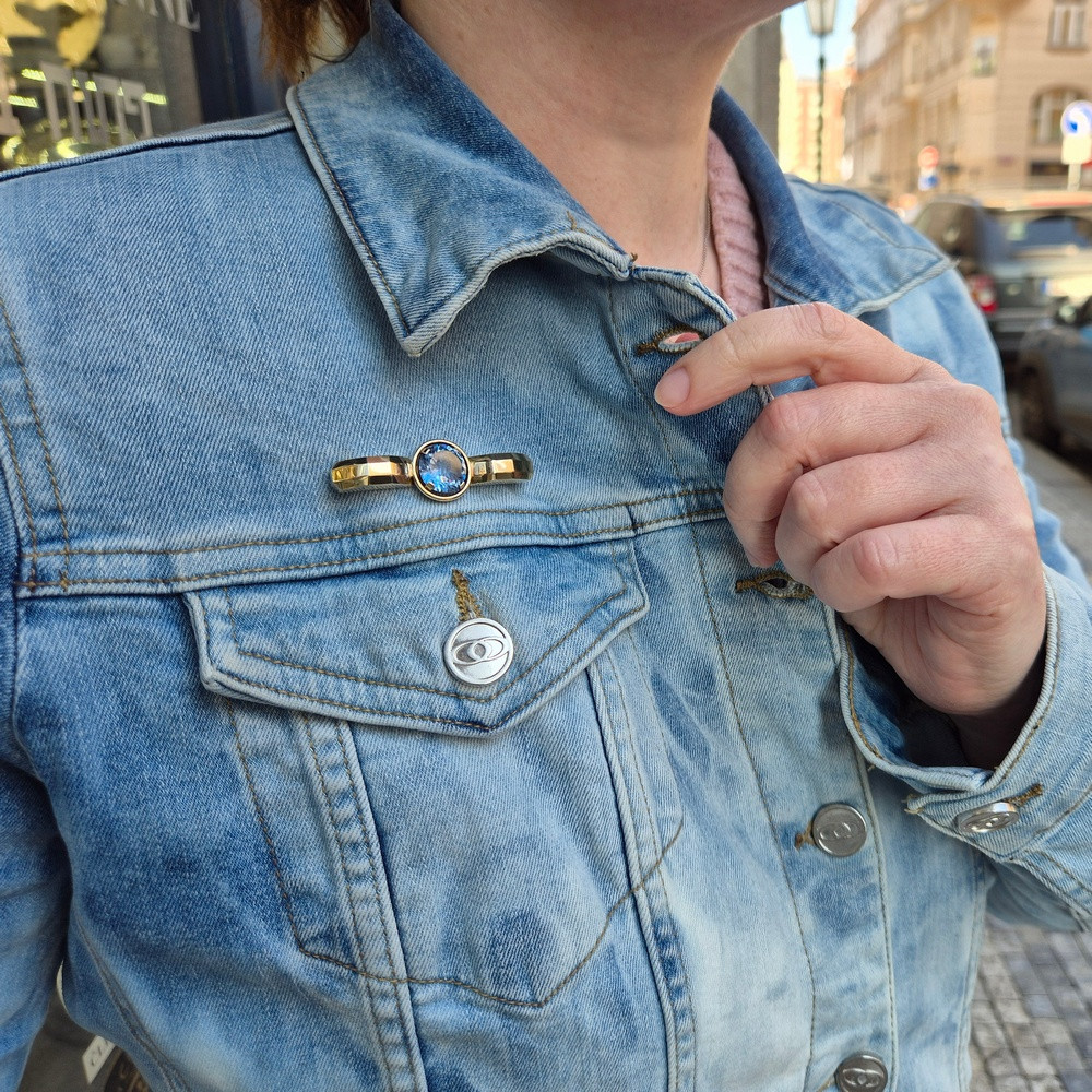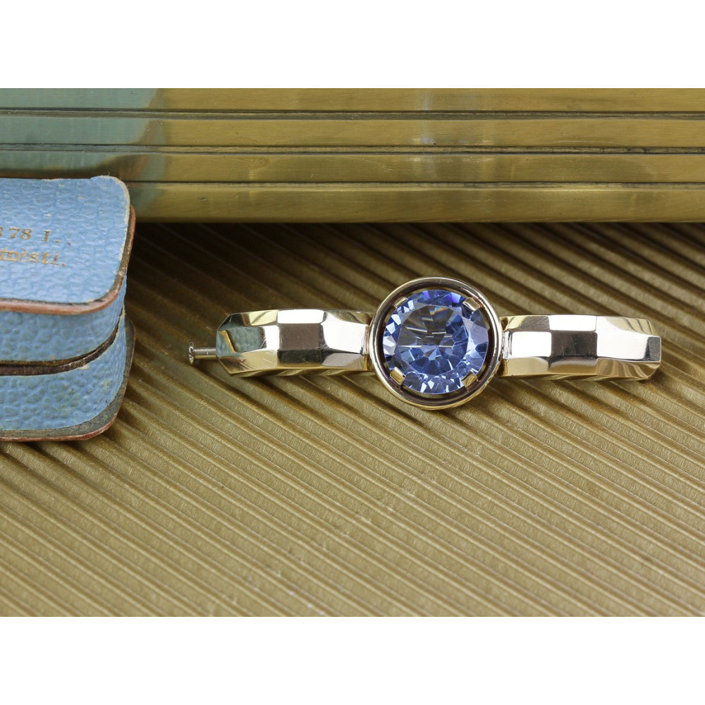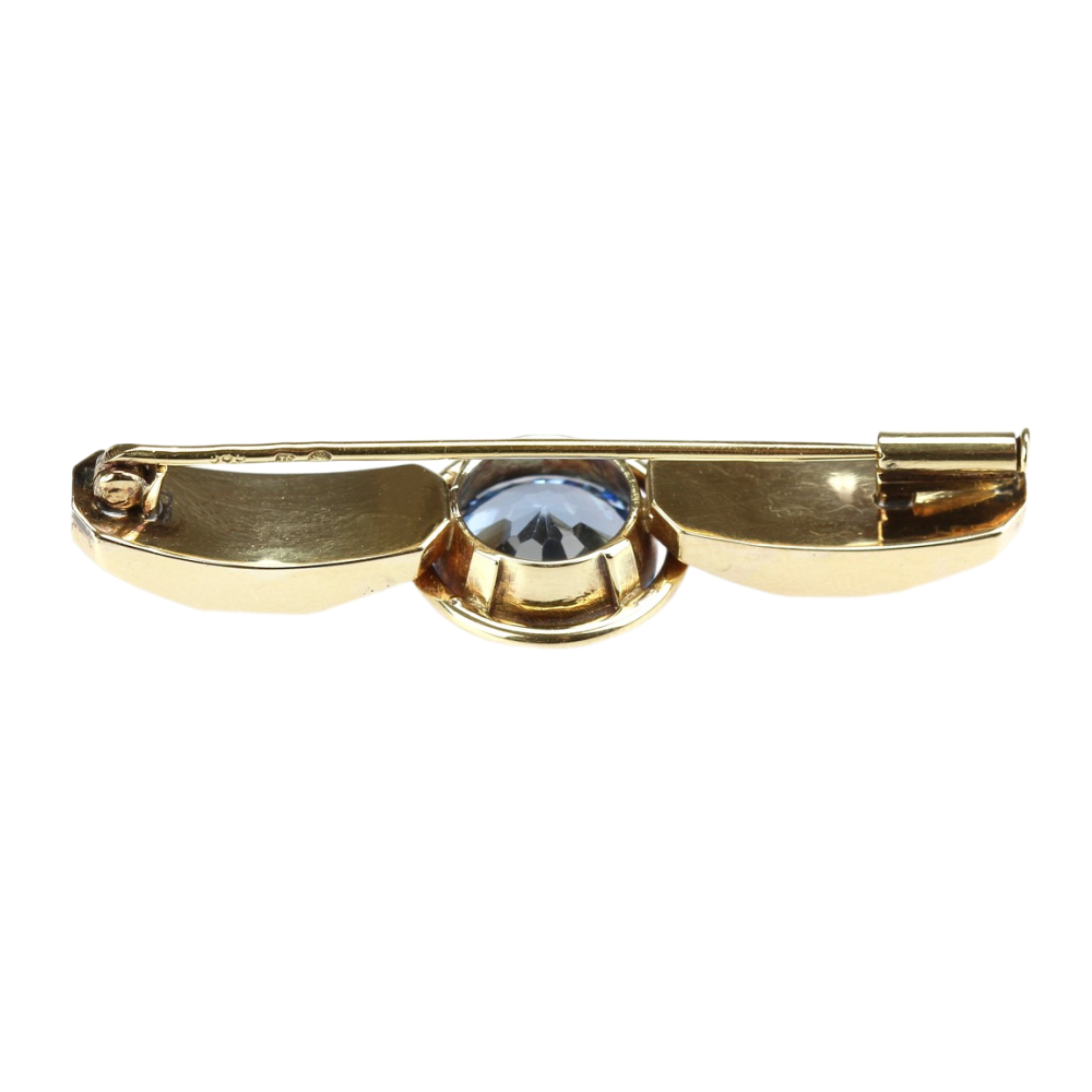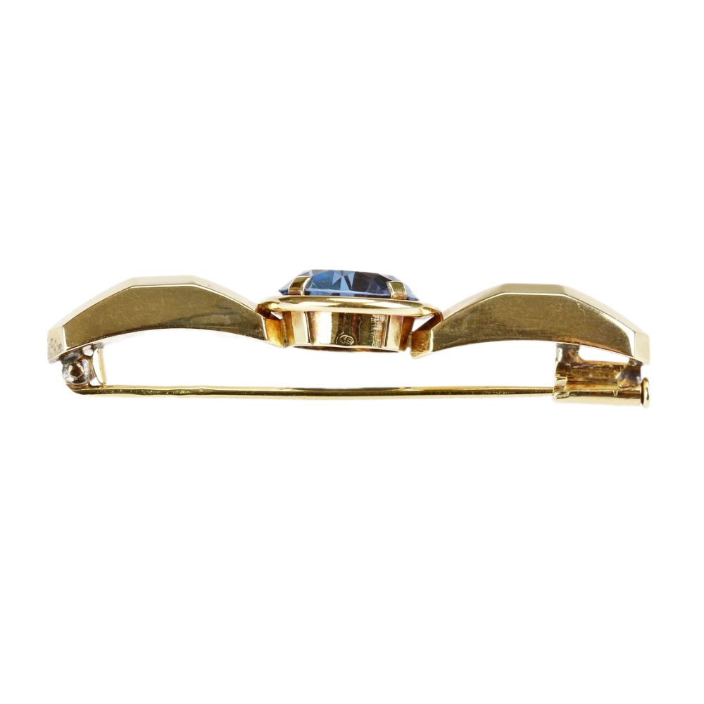 Masivní zlatá brož s kulatým syntetickým spinelem nebesky modré barvy je vyrobená v typicky art deco stylu 30. až 40. let 20. století.
