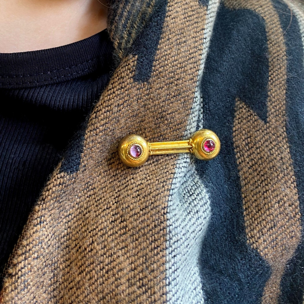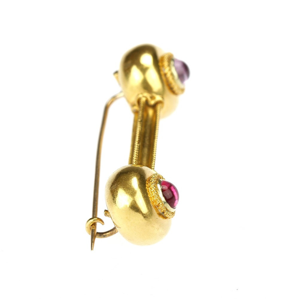 Plastická brož ze žlutého 14karátového dutého zlata (jehlice je ze zlata o ryzosti 480/1000) má zasazené dva přírodní ametysty kabošonového brusu. Zlatník docílil různého odstínu kamenů jejich podložením barevnou fólií. Zapínání na "C" sponu je funkční. Jehlice je posazená vysoko, proto je ideální brož připnout do silnějšího materiálu.