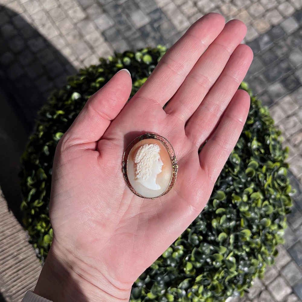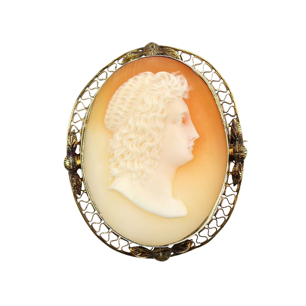 Mistrovsky řezaná mušlová kamej s motivem alegorie podzimu - žena s vinnými hrozny a listy ve vlasech.Kamej je zasazena v ornamentálním rámečku ze žlutého 14karátového zlata s jehlicí a sklápěcím očkem, dá se tedy nosit jako brož i přívěs.