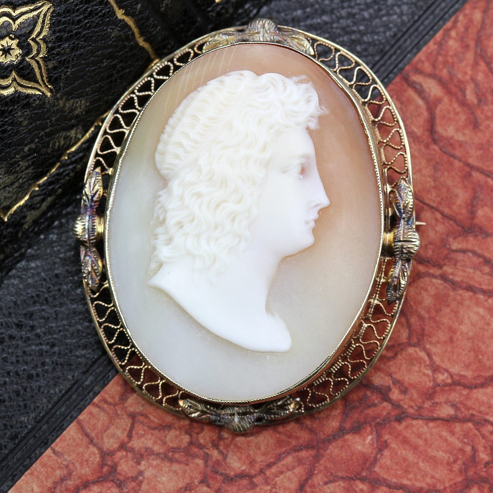 Mistrovsky vyvedená mušlová kamej s motivem řeckého boha Apollóna je zasazena v jednoduchém brožovém rámečku ze žlutého 17karátového zlata (Au 730/1000). Ryzost kovu je potvrzena osvědčením Puncovního úřadu.