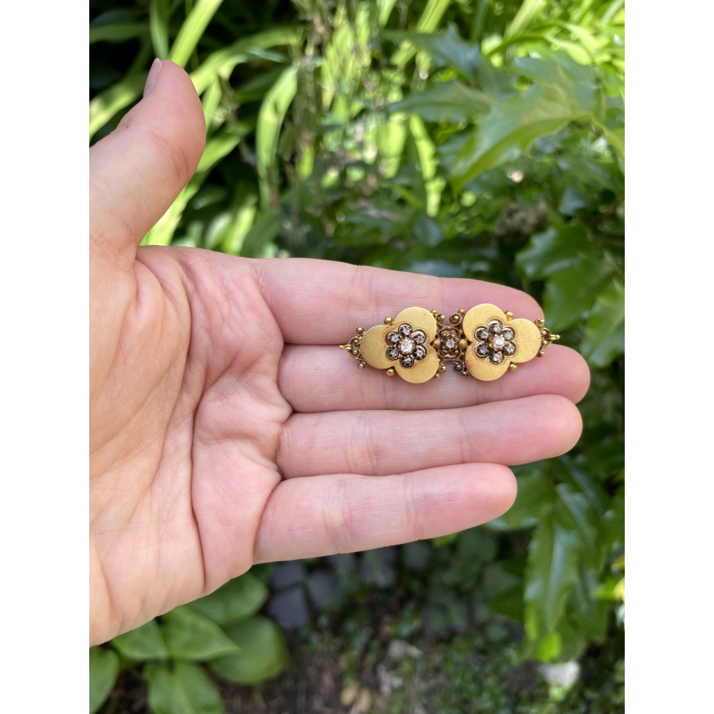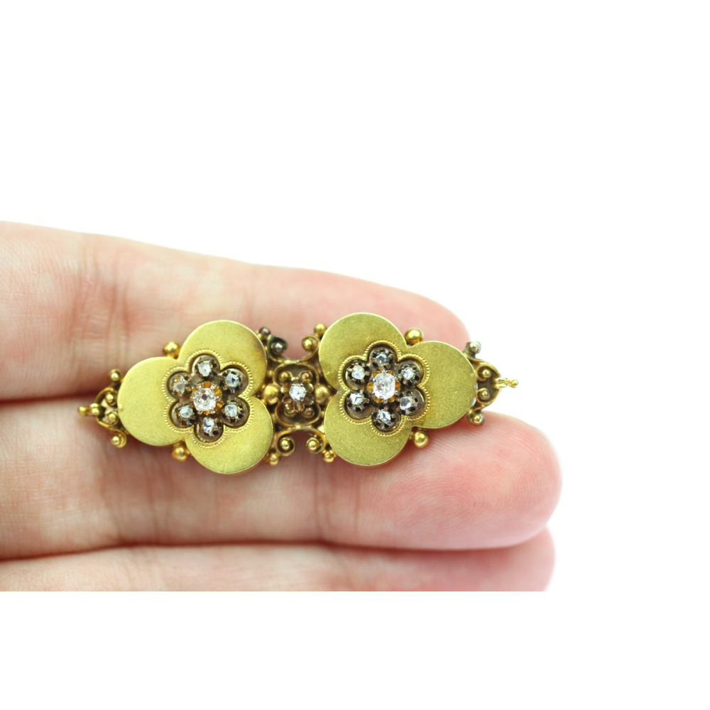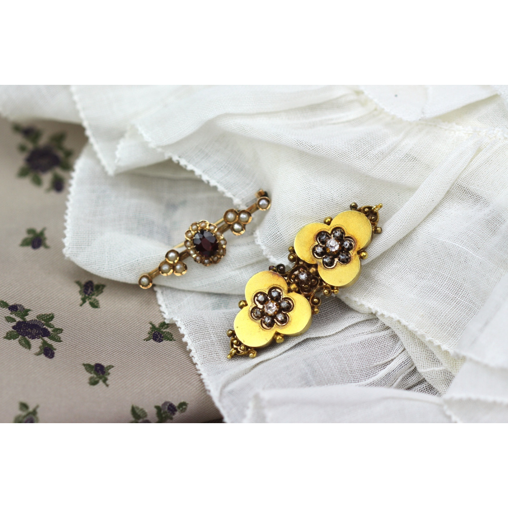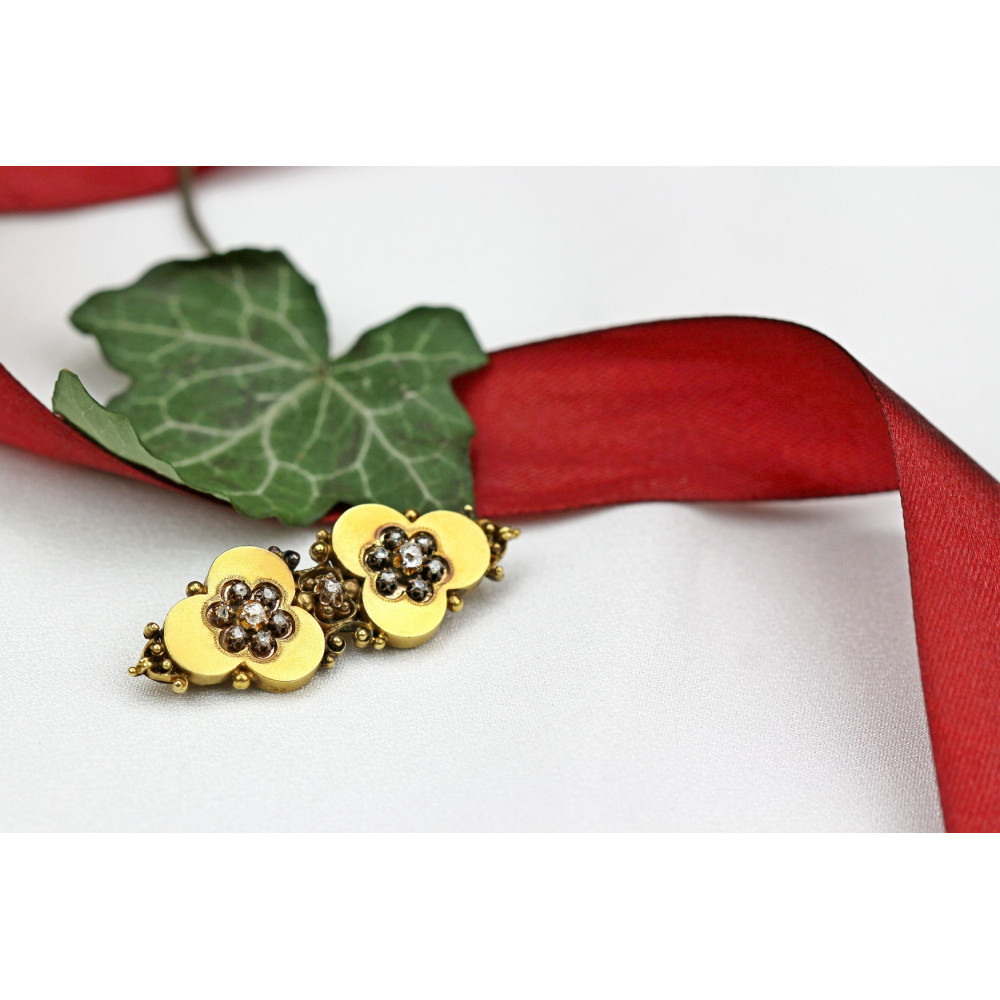Šperk z období kolem poloviny 19. století pravděpodobně původem z Prahy. Podélná brož s motivem dvojitého trojlístku ze žlutého 14karátového zlata (Au 580/1000) má matované plochy, v lince lehké gravírování, granulaci, do vzoru květin fasováné diamanty o celkové váze 0,50 ct (dva starobrusné diamanty a třináct diamantových rout).
