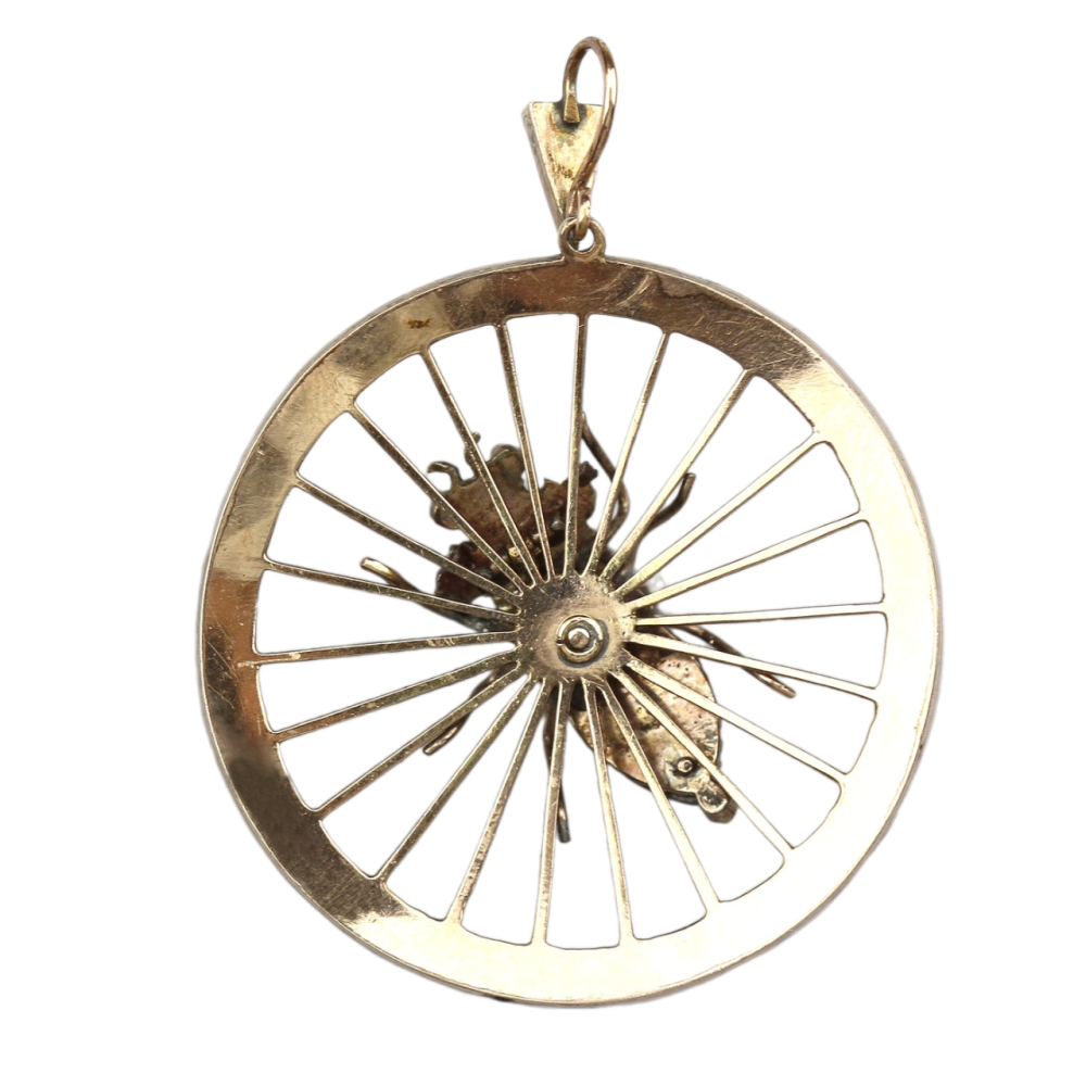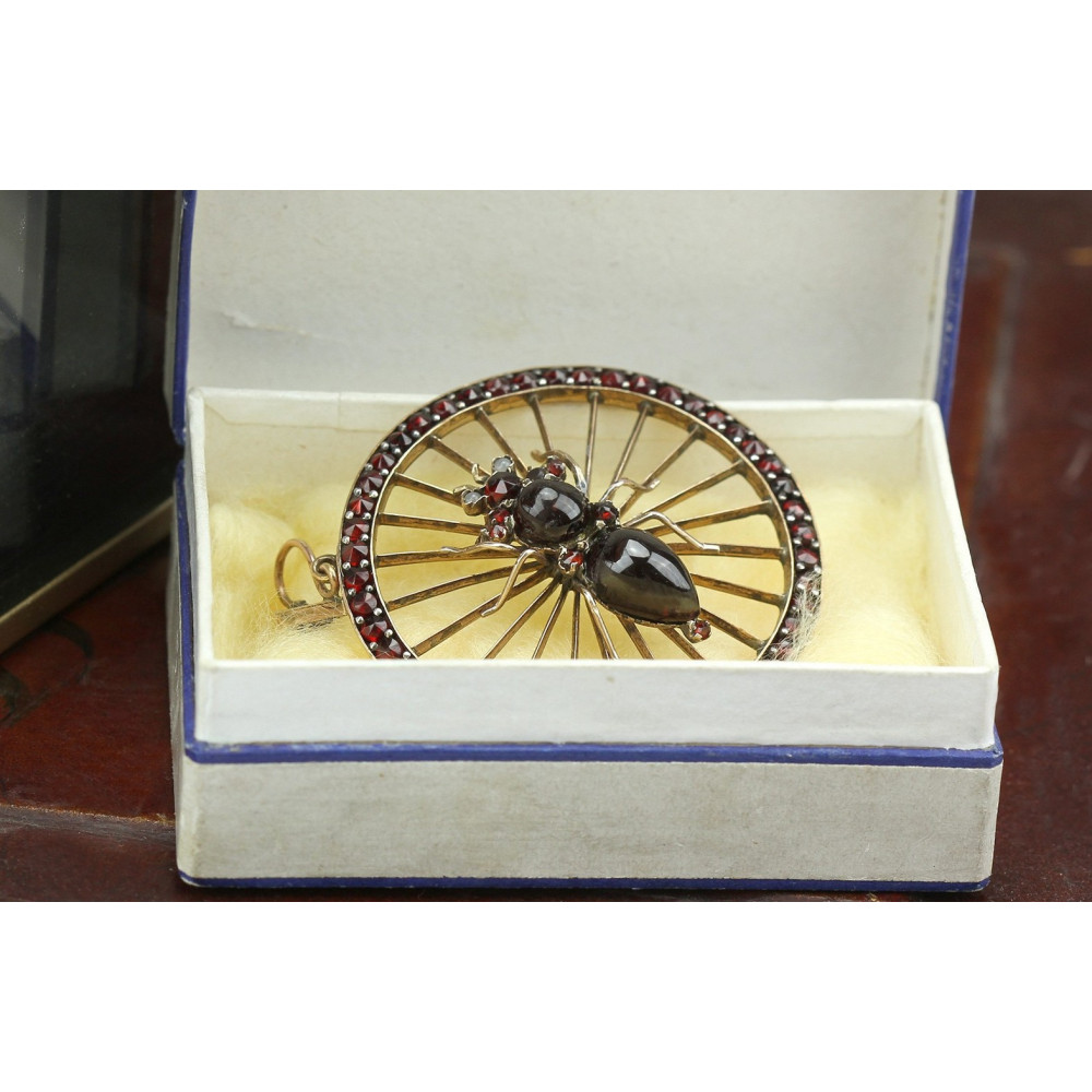 Výrazný kruhový přívěs s motivem pavoučka na pavučině vyrobený z tombaku (obecný kov), přírodních českých granátů a dvou velkých almandinů (pavouček).