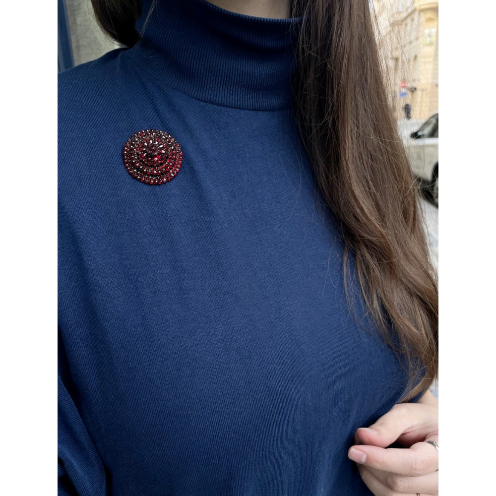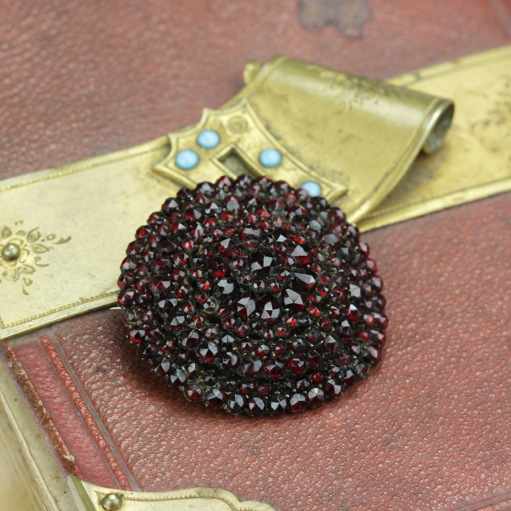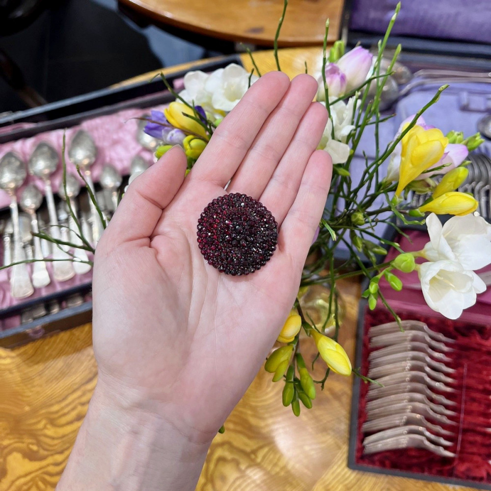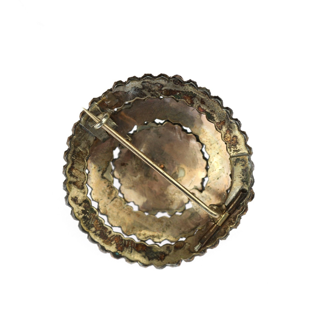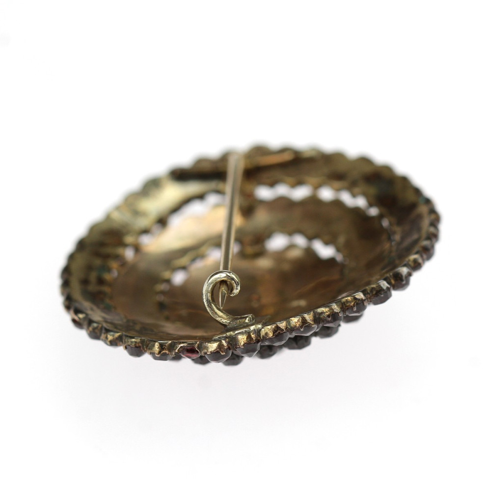 Kulatá brož tvořená čtyřmi odstupňovanými rozetami, vyrobená ve 2. polovině 19. století. Zhotovena z tombaku (obecného kovu) a osazena přírodními českými granáty. Funkční zapínání na „C“ sponu, brož na oděvu pevně drží.