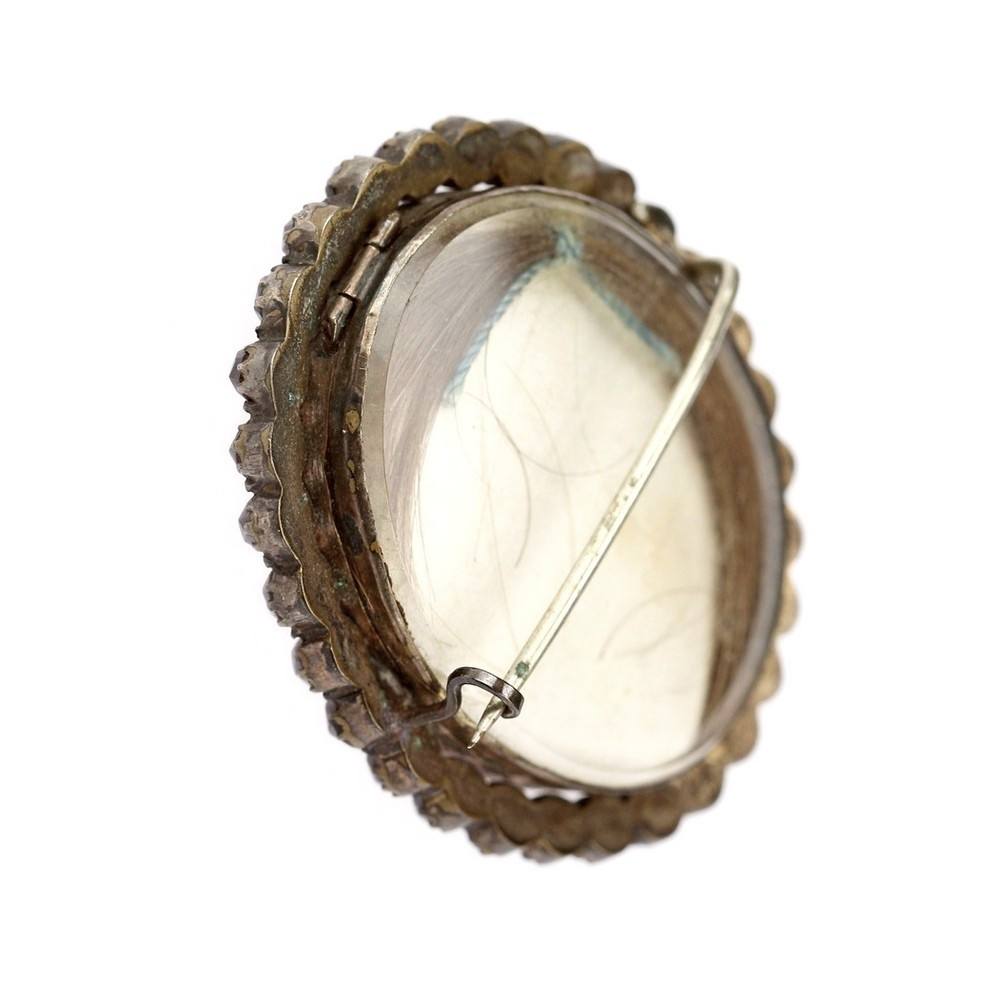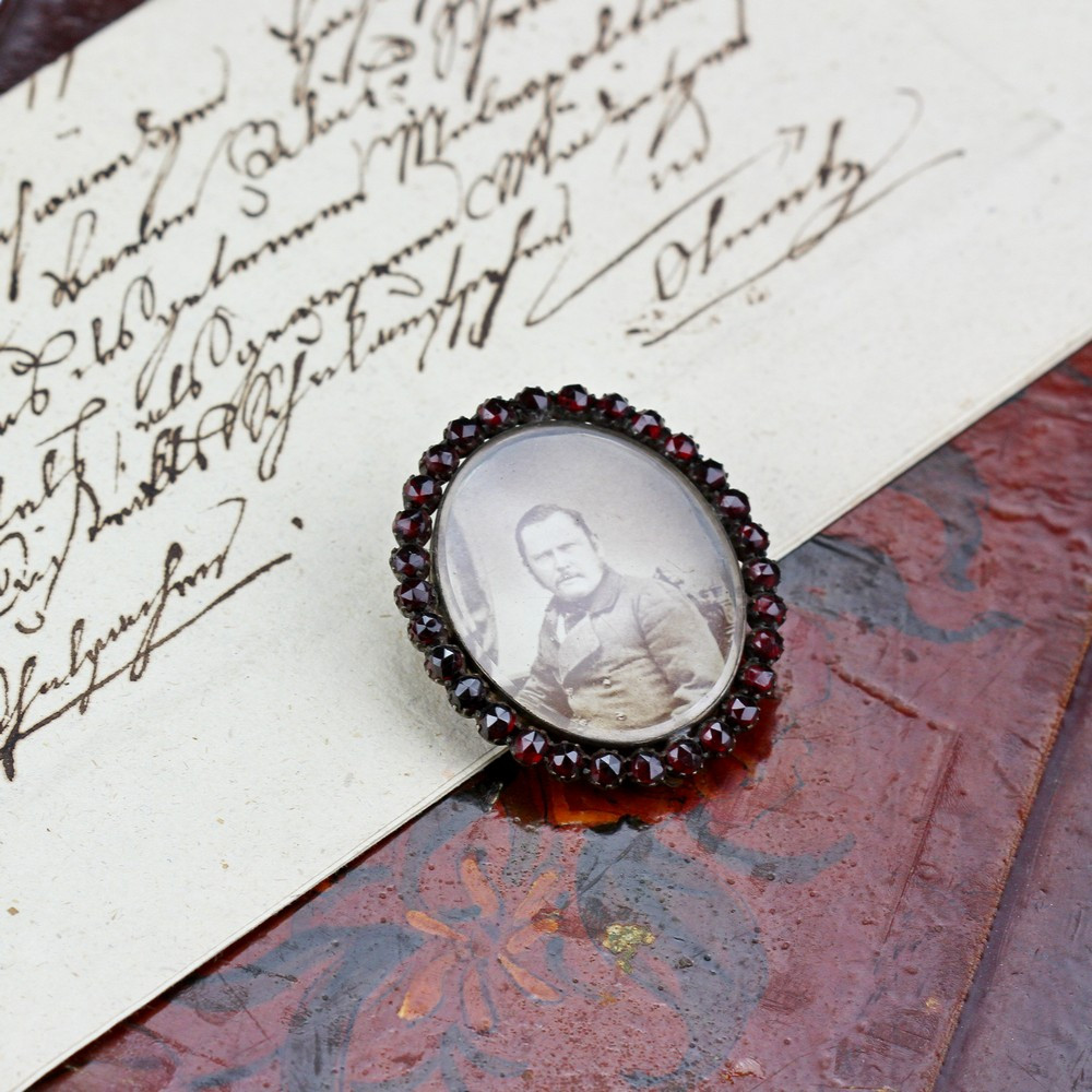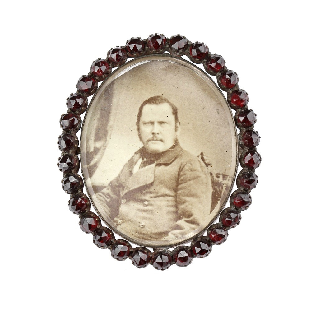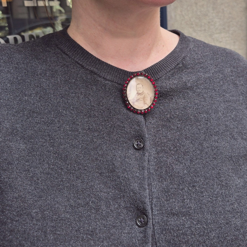 Oválná brož s medailonem na fotografii a drobnou památku je vyrobena z tombaku, přední i na pant vyklápěcí zadní část jsou tvořeny původním sklíčkem. Medailon pak rámují přírodní české granáty routového brusu.