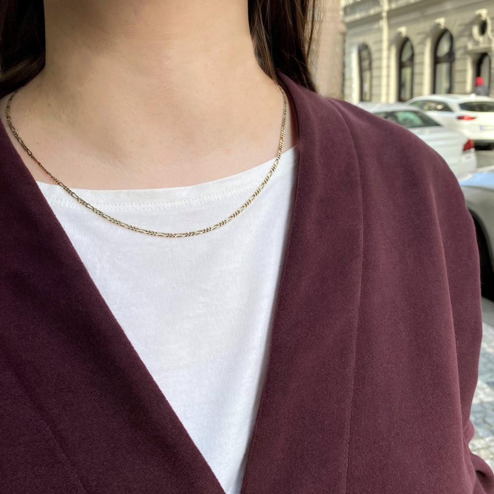 Prvorepublikový řetízek typu rolo ze žlutého 14karátového zlata. Zhruba v polovině náhrdelníku se nachází jedno větší očko, díky kterému lze elegantně řetízek na krku zdvojit (délka řetízku by byla 38 a 41 cm). Zapínání na pérový kroužek. Značeno prvorepublikovým puncem "čejka" užívaným ve 20. letech 20. století.
