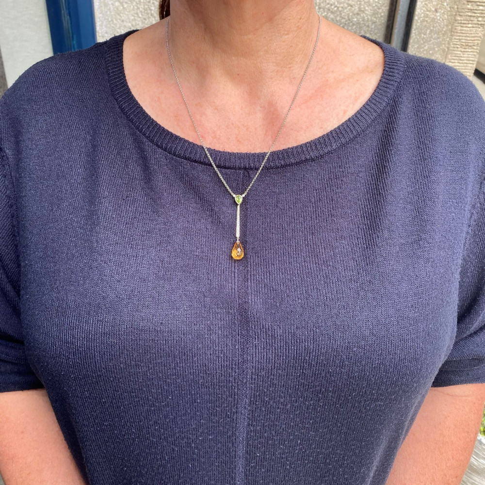 Náhrdelník zhotovený z bílého 18karátového zlata s přírodním peridotem, přírodním citrínem brusu brioleta o váze 6,15 ct a přírodními diamanty briliantového brusu o celkové váze 0,08 ct (4× 0,01 ct, 8× 0,005 ct, barva G-H a čistota VS-SI).