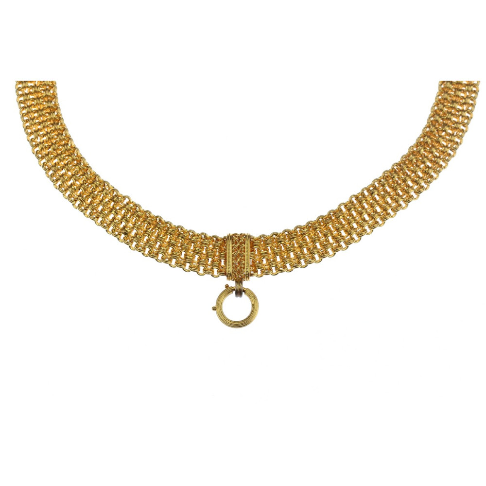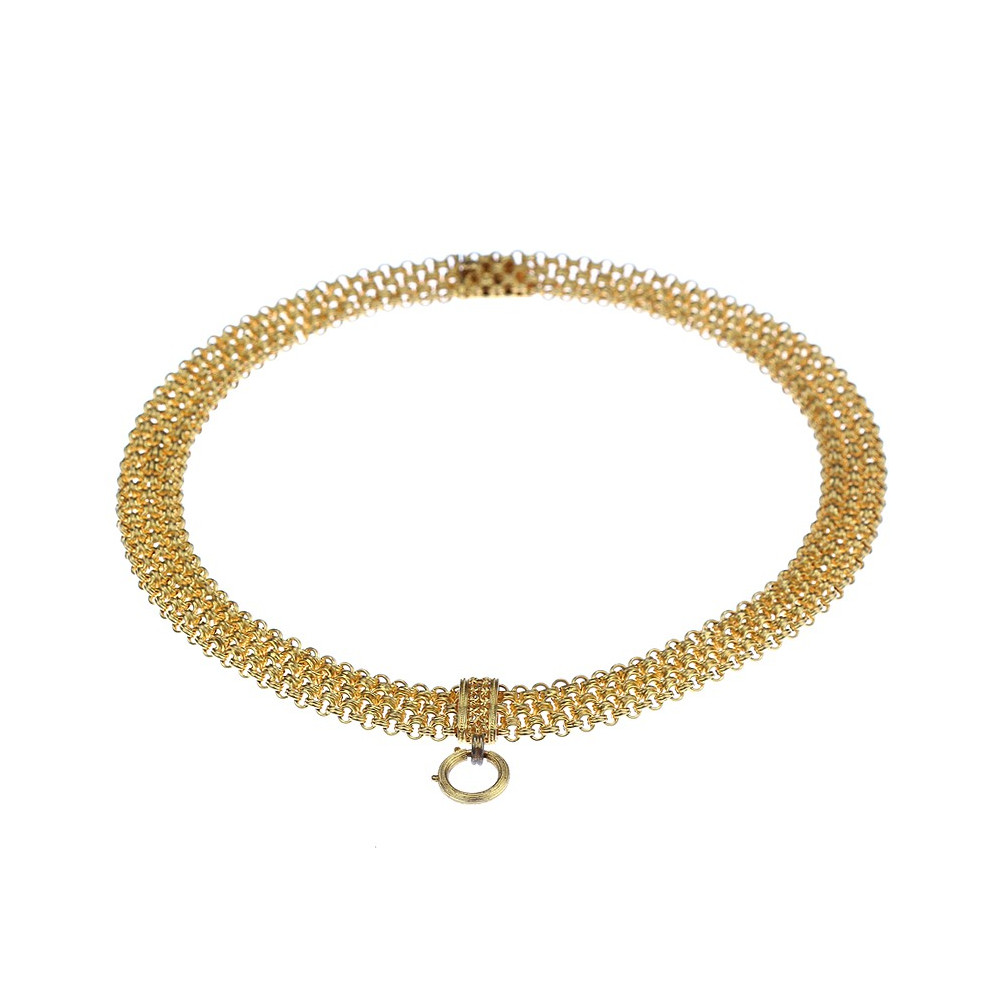 Honosný zlatý náhrdelník složený ze čtyř spojených řetízků typu Garibaldi (zdvojená očka). Po celé jeho délce se může volně pohybovat jezdec s pružinovým kroužkem, na který si původní majitel zavěsil otevírací medailon. Zapínání je řešeno klasickým jazýčkovým uzávěrem, který byl oražen v Praze rakousko-uherským puncem užívaným v letech 1868–1901 pro cizí zboží.