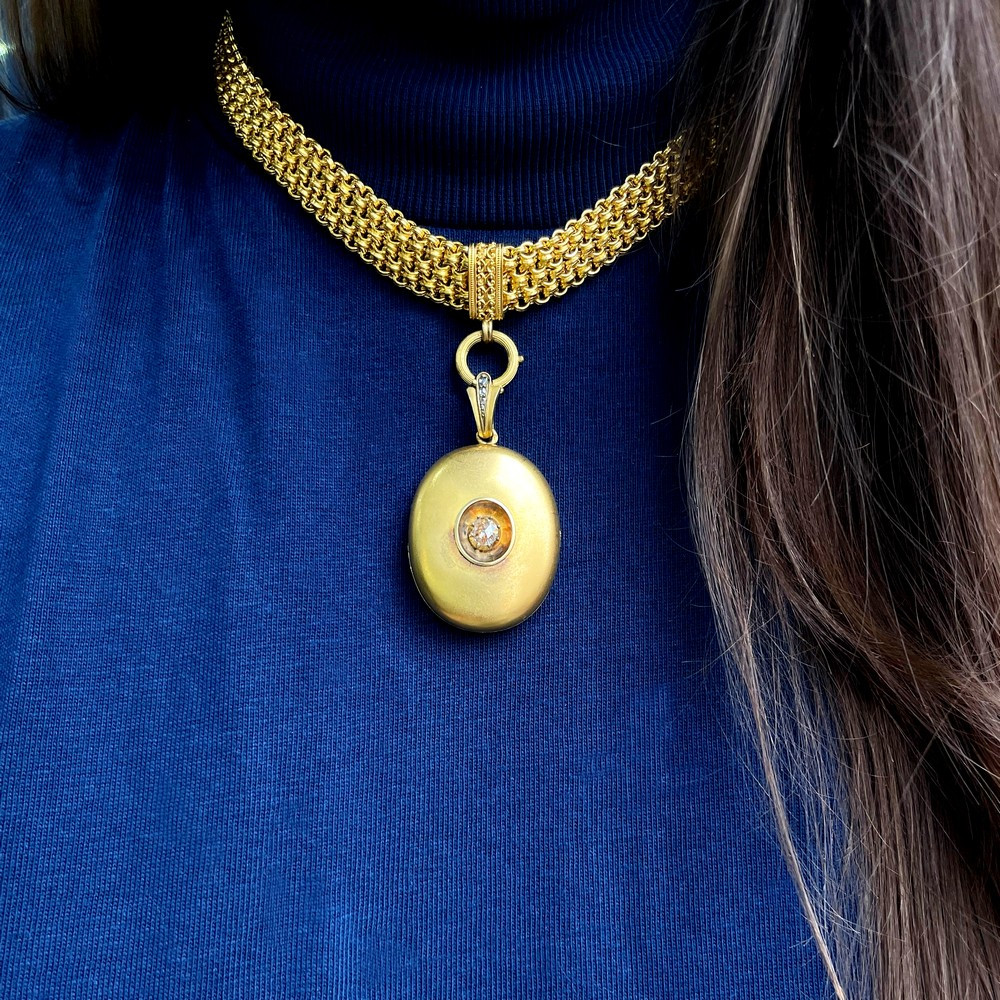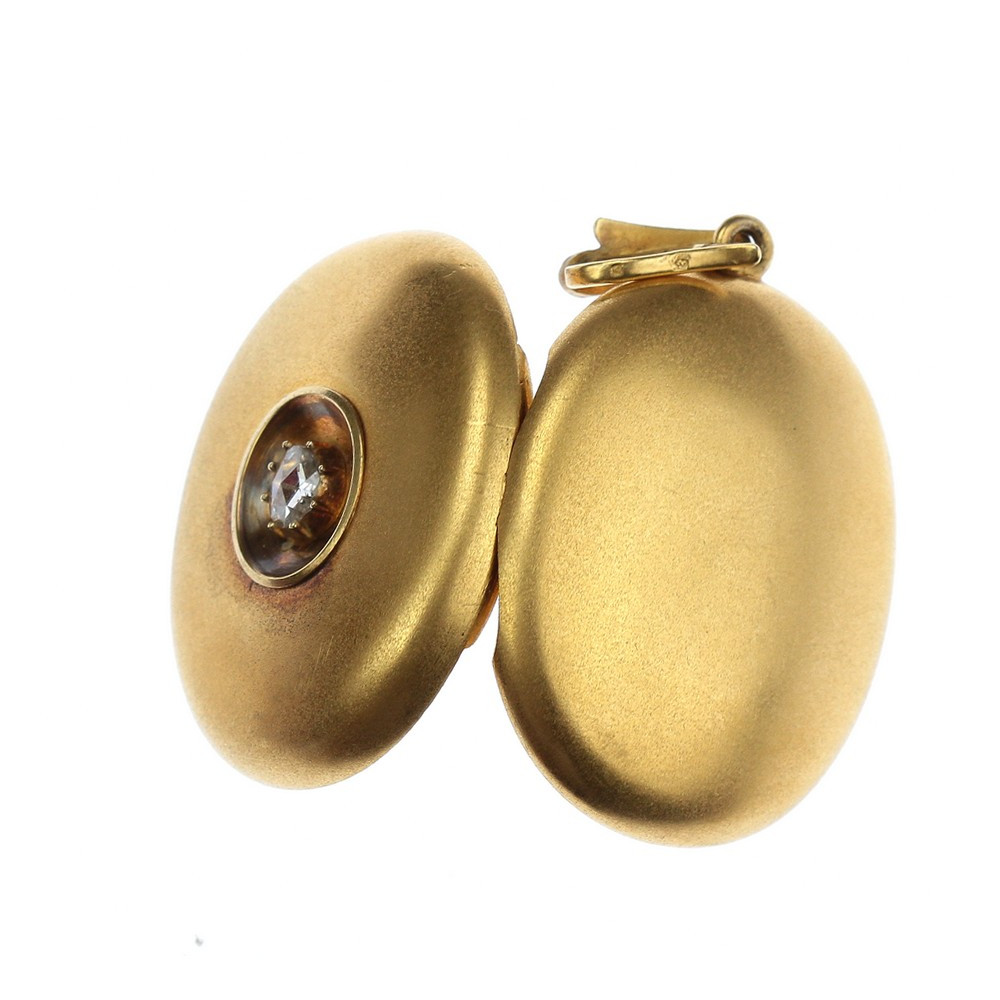 Oválný medailon má vnější pláště matované, přičemž přední strana i očko jsou fasovány přírodními diamanty routového brusu. Značeno rakousko-uherským puncem používaným po roce 1872. Předmět nese jemnou patinu, kterou na požádání rádi bezplatně odstraníme.