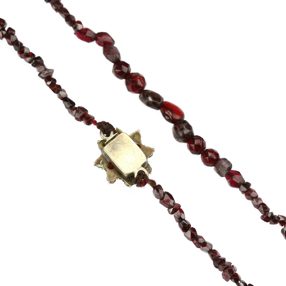 Dlouhá šňůra z navlečená z korálků přírodních granátů různého druhu a velikosti. Zapínání z obecného kovu je osazeno granáty plochého brusu.