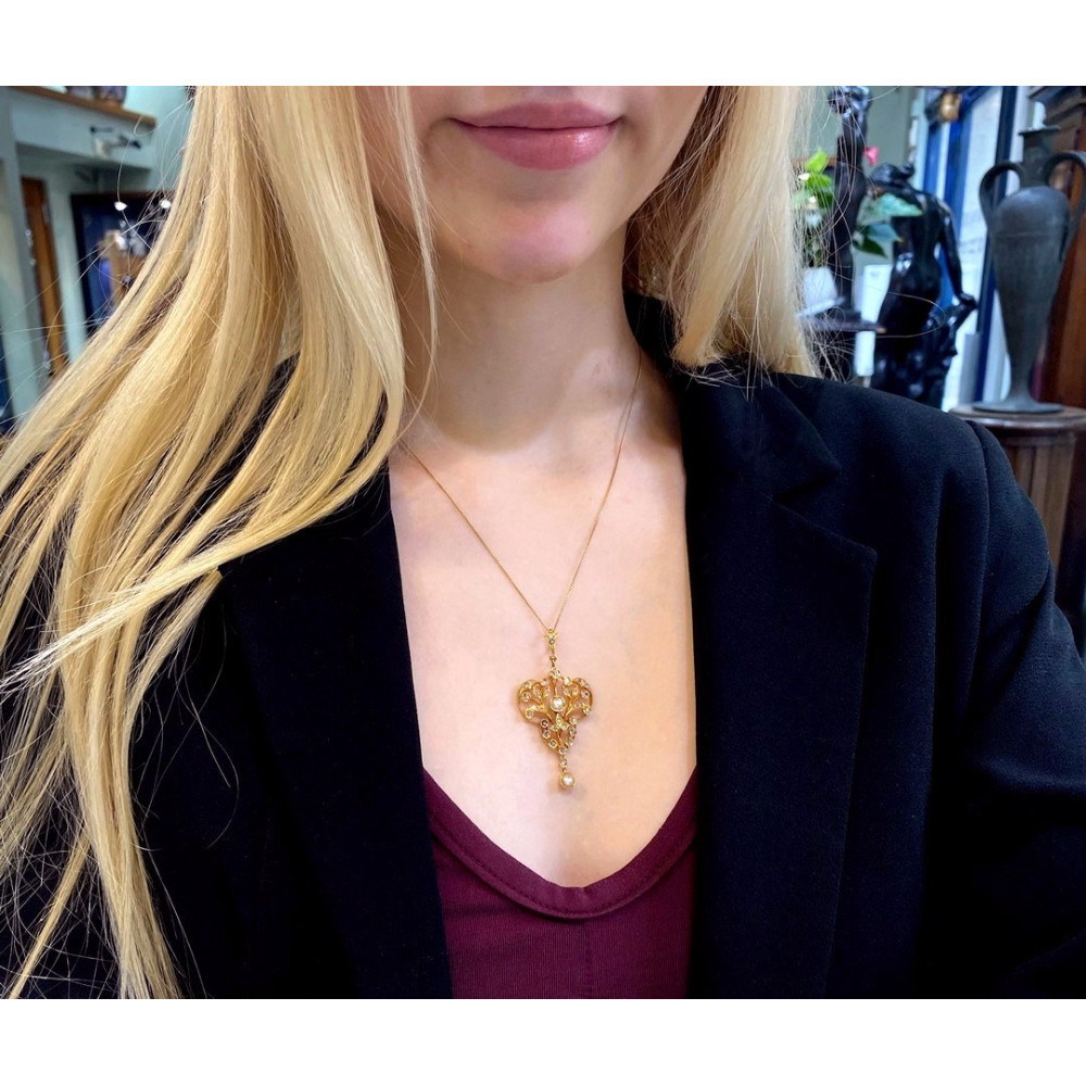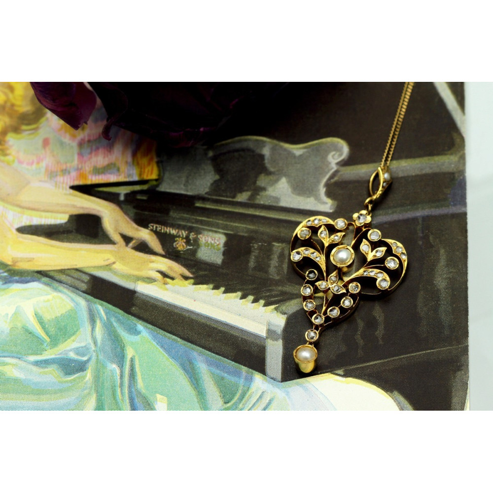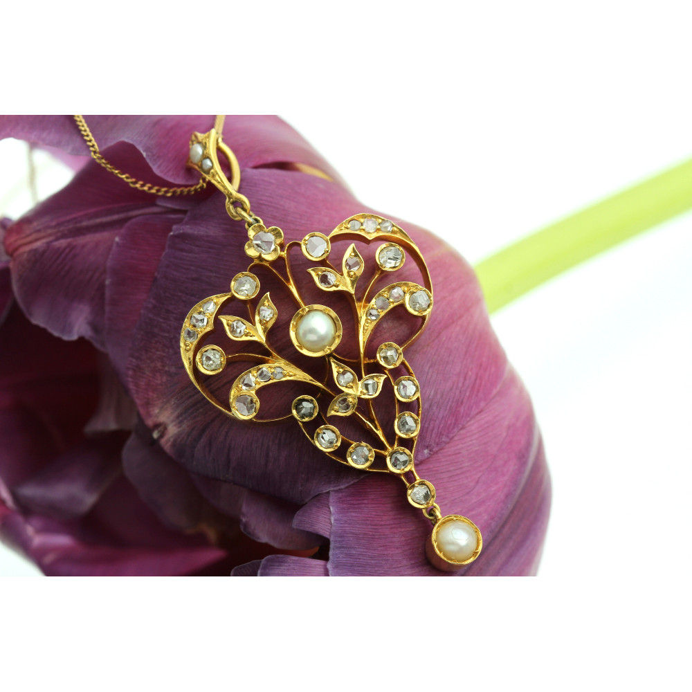 Secesní přívěsek má do svého členitého povrchu s florálním motivem zasazené 4 přírodní perličky a 33 přírodních diamantů routového brusu.