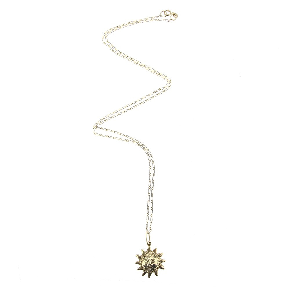 Zlatý řetízek s přívěskem ve tvaru slunce, vyrobený ze žlutého 14karátového zlata. Opatřeno ryzostním číslem 585 a platným puncem "labuť".