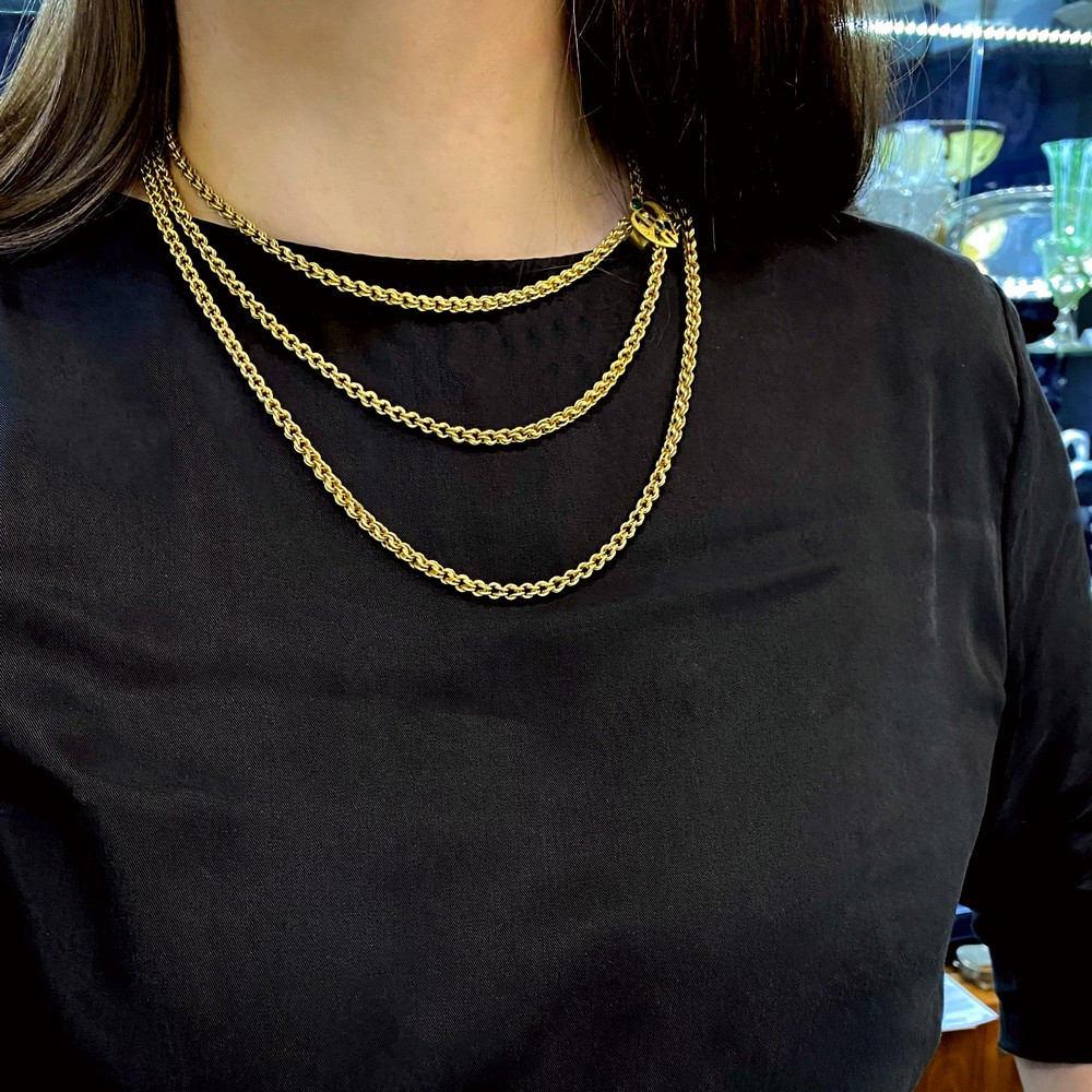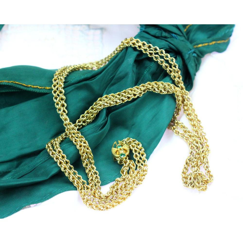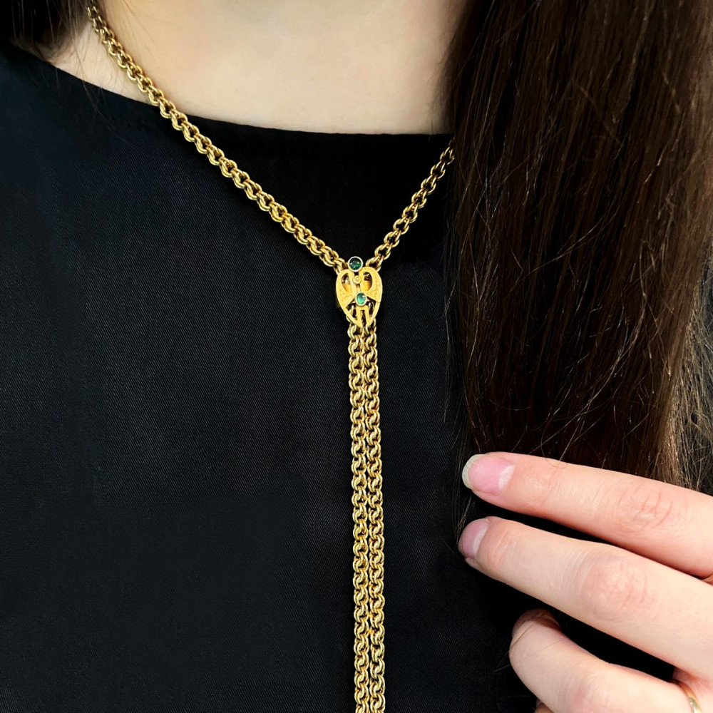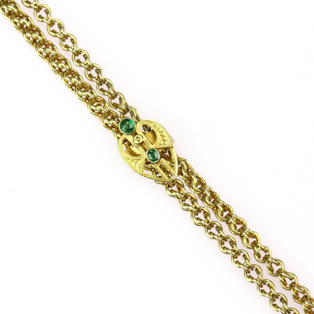 152 cm dlouhý řetěz, šatlén, zhotovený ze žlutého 14karátového zlata. Posuvný jezdec na řetězu v secesním designu je zdobený dvěma zelenými sklíčky imitujícími drahé kameny. Předmět je značen rakousko-uherským puncem "lišky" a písmenem "C" (puncováno v Praze). Jedná se o krásnou umělecko-řemeslnou ruční práci.