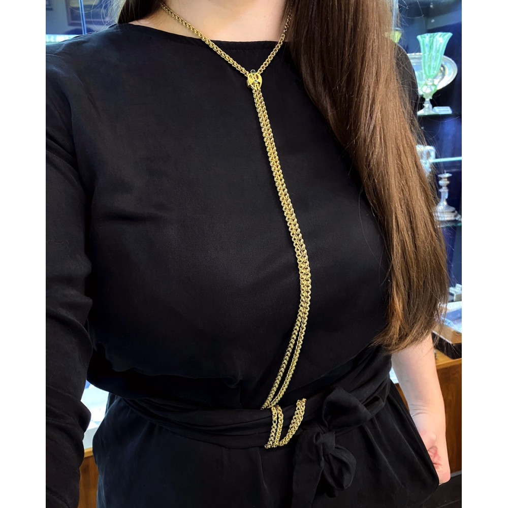 152 cm dlouhý řetěz, šatlén, zhotovený ze sytě žlutého 14karátového zlata. Posuvný jezdec na řetězu v secesním designu je osazen syntetickým rubínkem. Předmět je značen rakousko-uherským puncem "liška" a písmenem "C" (puncováno v Praze).