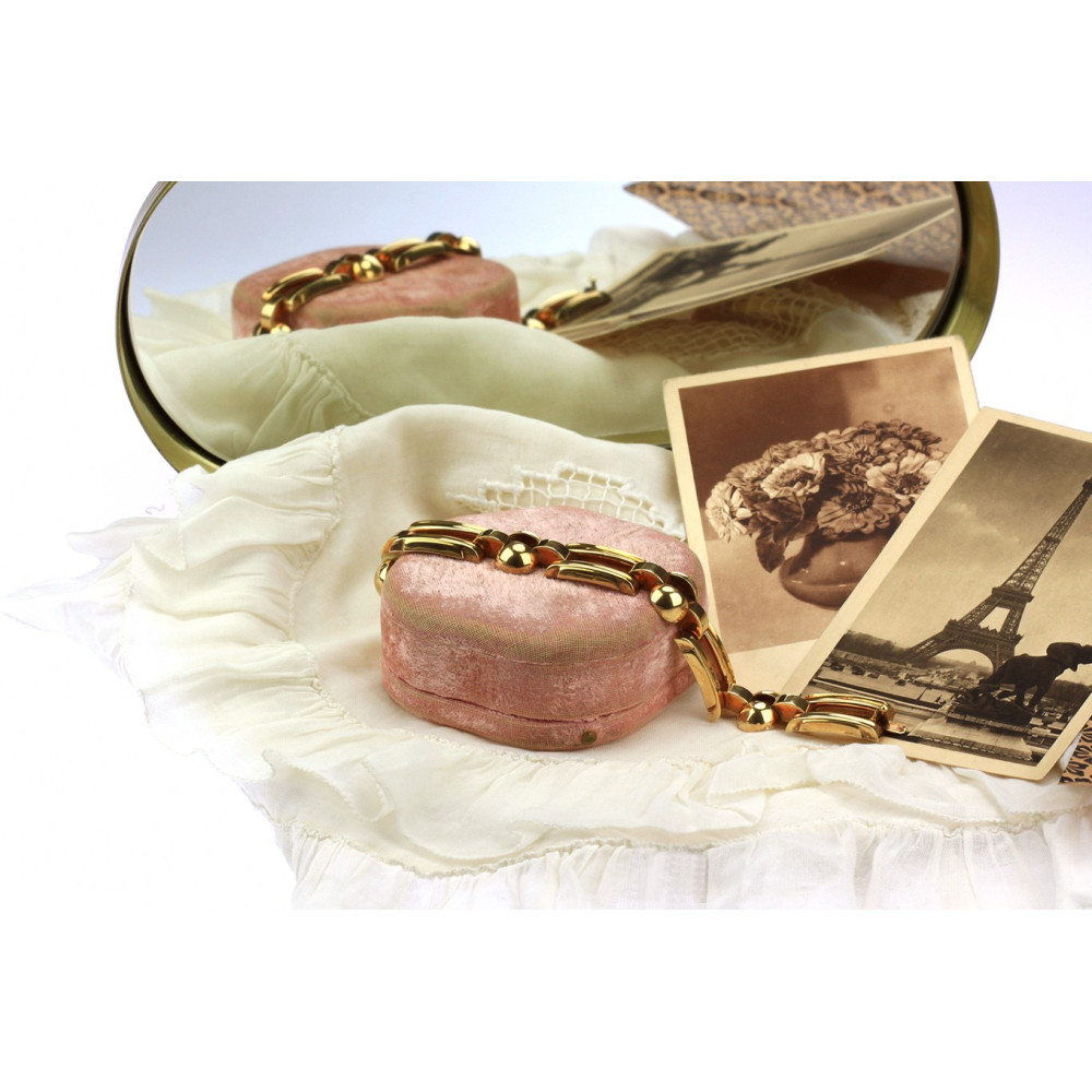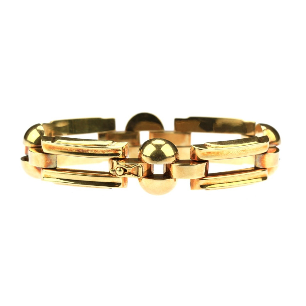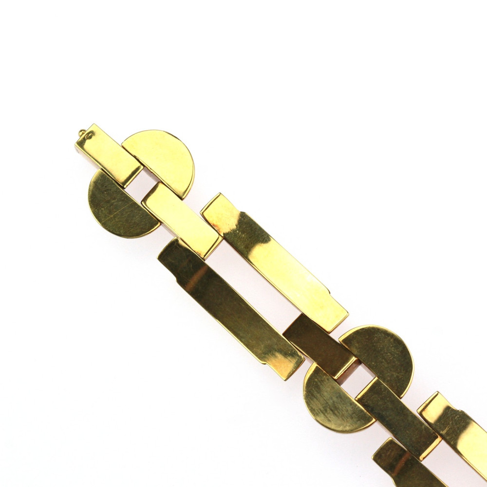 Klasický art deco článkový náramek vyrobený v druhé polovině 40. let 20. století pod družstvem zlatníků Karat v Brně. Jednotlivé duté 14karátové články ze žlutého zlata střídají obdélné a zaoblené prvky, které jsou na povrchu leštěné a lehce profilované. Značeno prvorepublikovým puncem "lvíček" užívaným v Československu mezi lety 1929-1949, ryzostním číslem a písmenem "K" v kosočtverci (Karat).