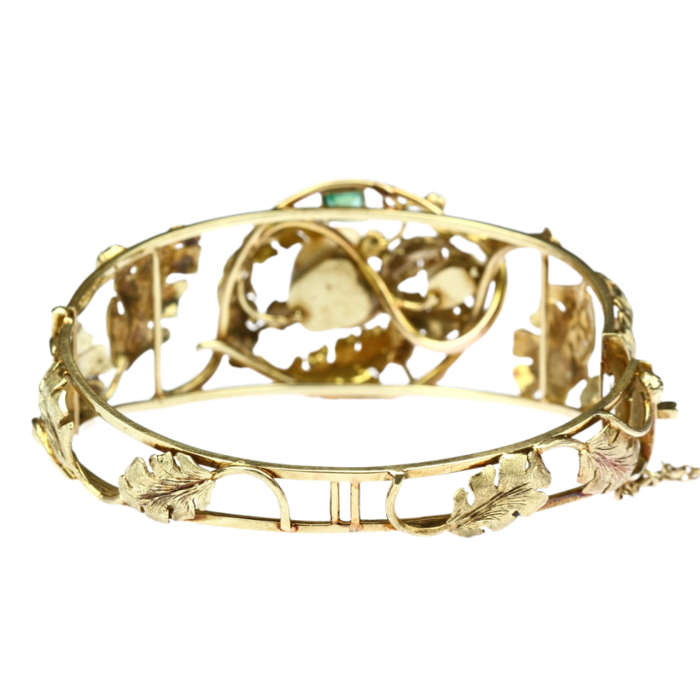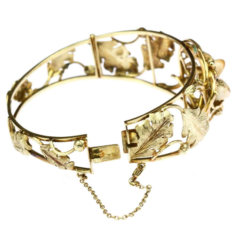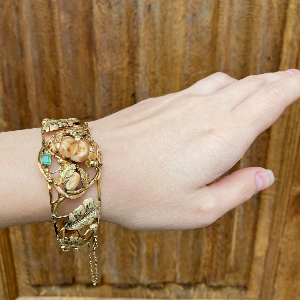 Myslivecký náramek, který tvoří plasticky modelované dubové větvičky ze žlutého 14karátového zlata, grandle a přírodní smaragd o váze 0,38 ct. Několik částí je zlaceno růžovým zlatem. Pevný náramek má otevírání na kloub. Na jazýčkovém uzávěru byl nově opuncován současným českým puncem "labuť". U zapínání se nachází odepínací bezpečnostní řetízek.