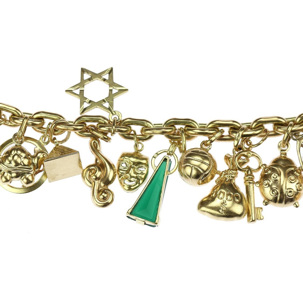 Náramek tzv. žebrák ze žlutého 14karátového zlata ověšený 17 zlatými přívěsky z různobarevného 14karátového zlata a drahých kamenů (mořský korál, jadeit, malachit, perlička). Několik přívěsků je zhotoveno z 10 - 9karátového zlata. Zavírání je doplněno pojistkou a pojistným řetízkem proti náhodnému otevření.Přívěsky sbíral původní majitel pravděpodobně na...